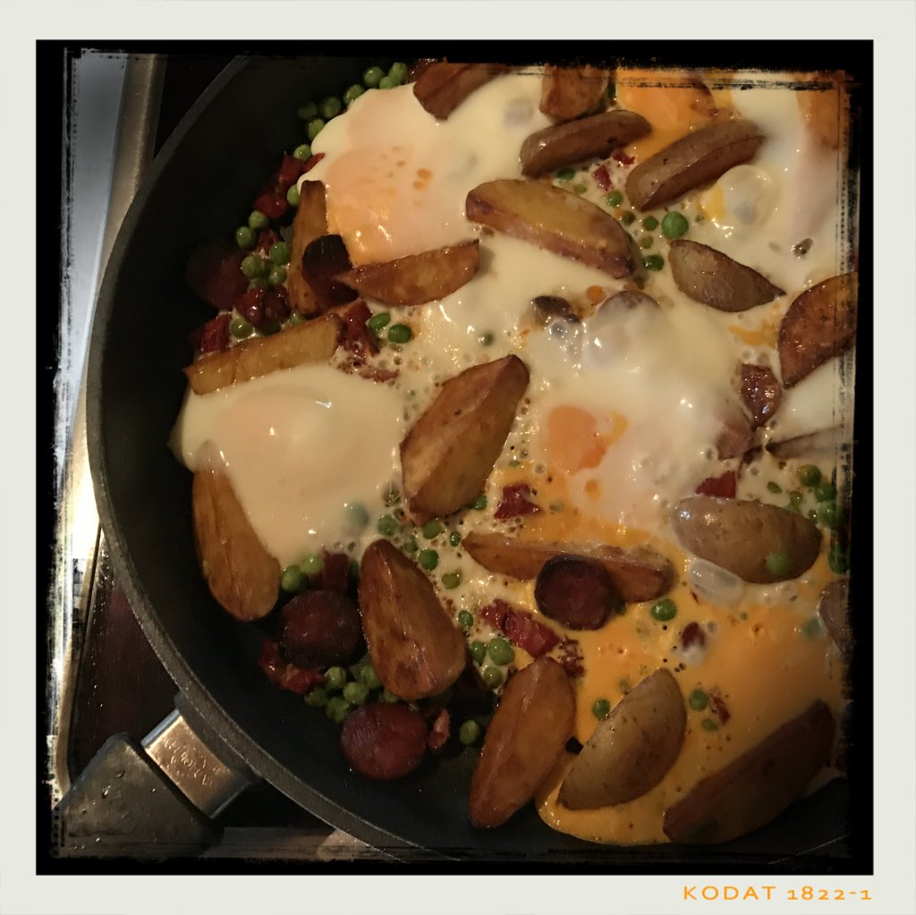 6 Eier (mögl. M) aus größerer Höhe auf das Gemüse klatschen lassen, die Pfanne mit dem Deckel schließen und die Eier in ca. 3 Min. stocken lassen, dann noch etwas