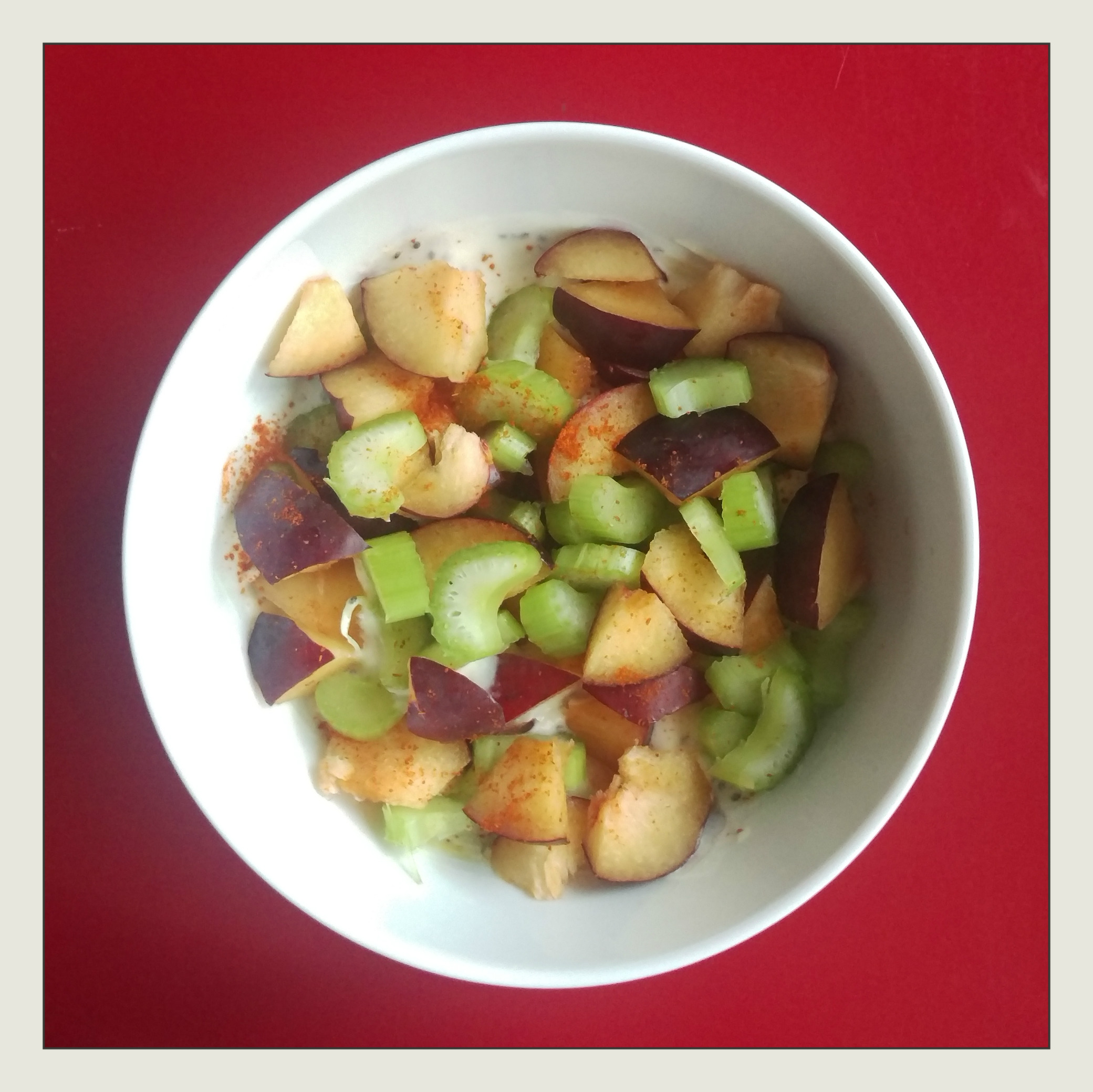1 Stange Staudensellerie (in dünne Scheiben geschnitten) auf dem Joghurt verteilen und mit