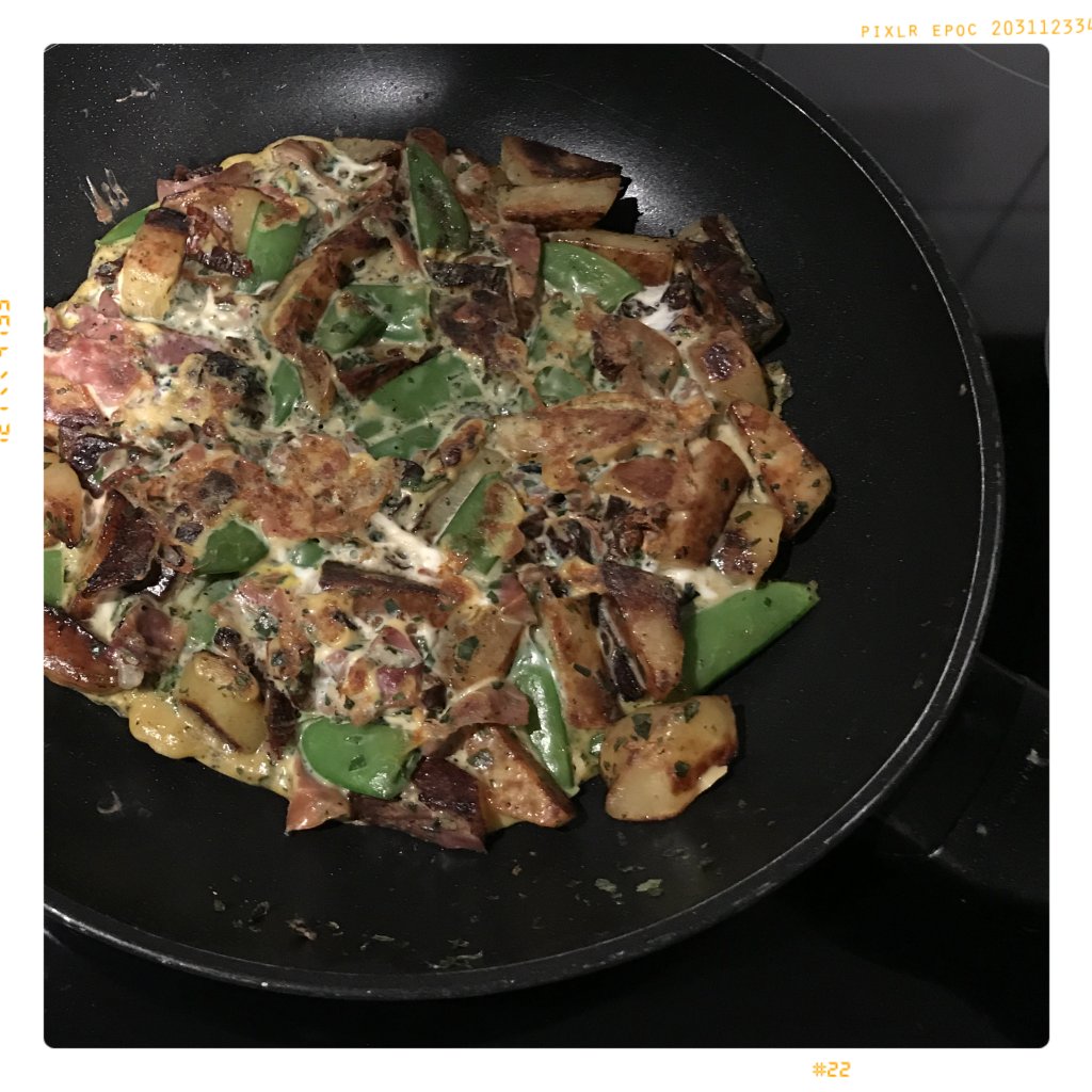 1 EL TK Basilikum zur Kartoffelmischung geben, kurz heiß werden lassen