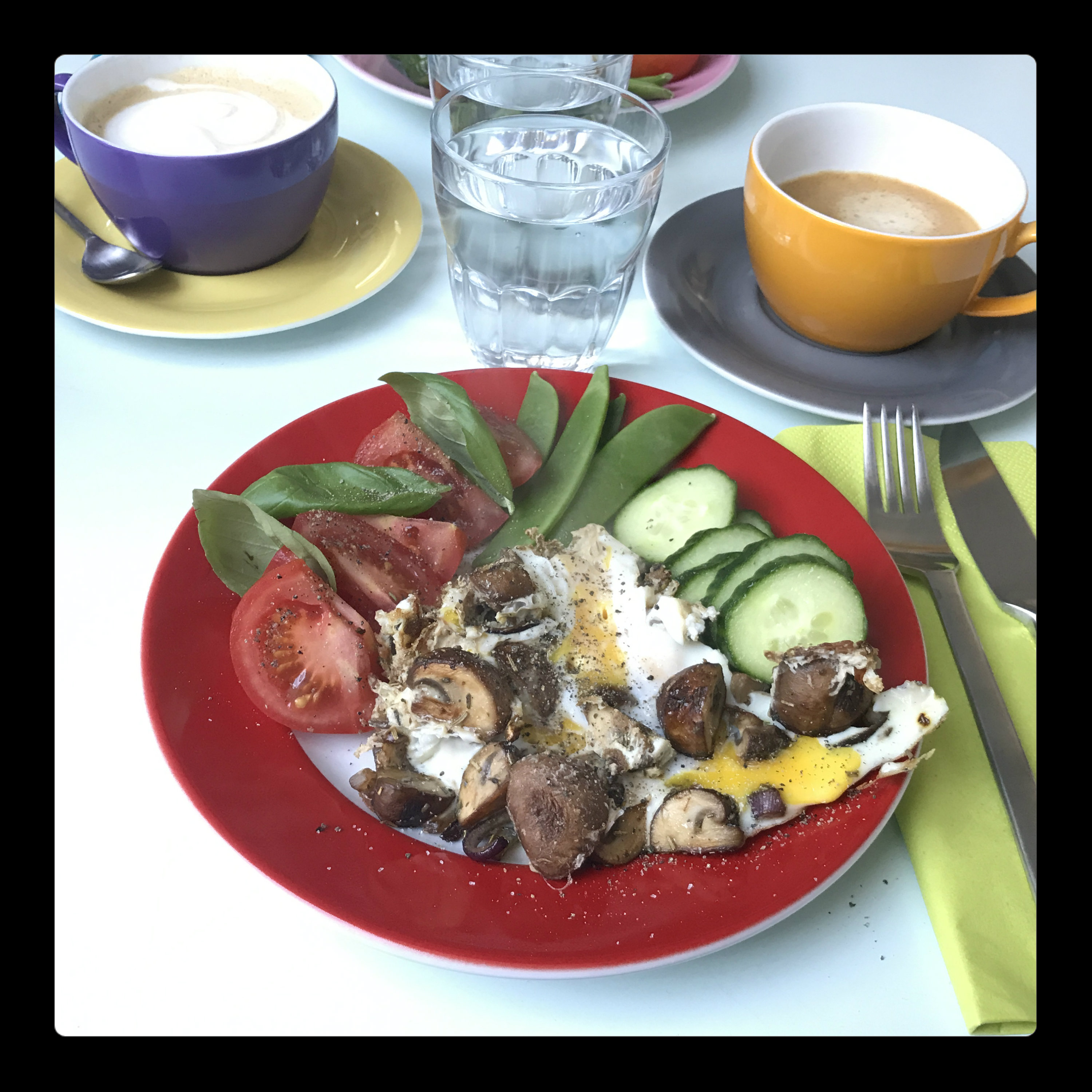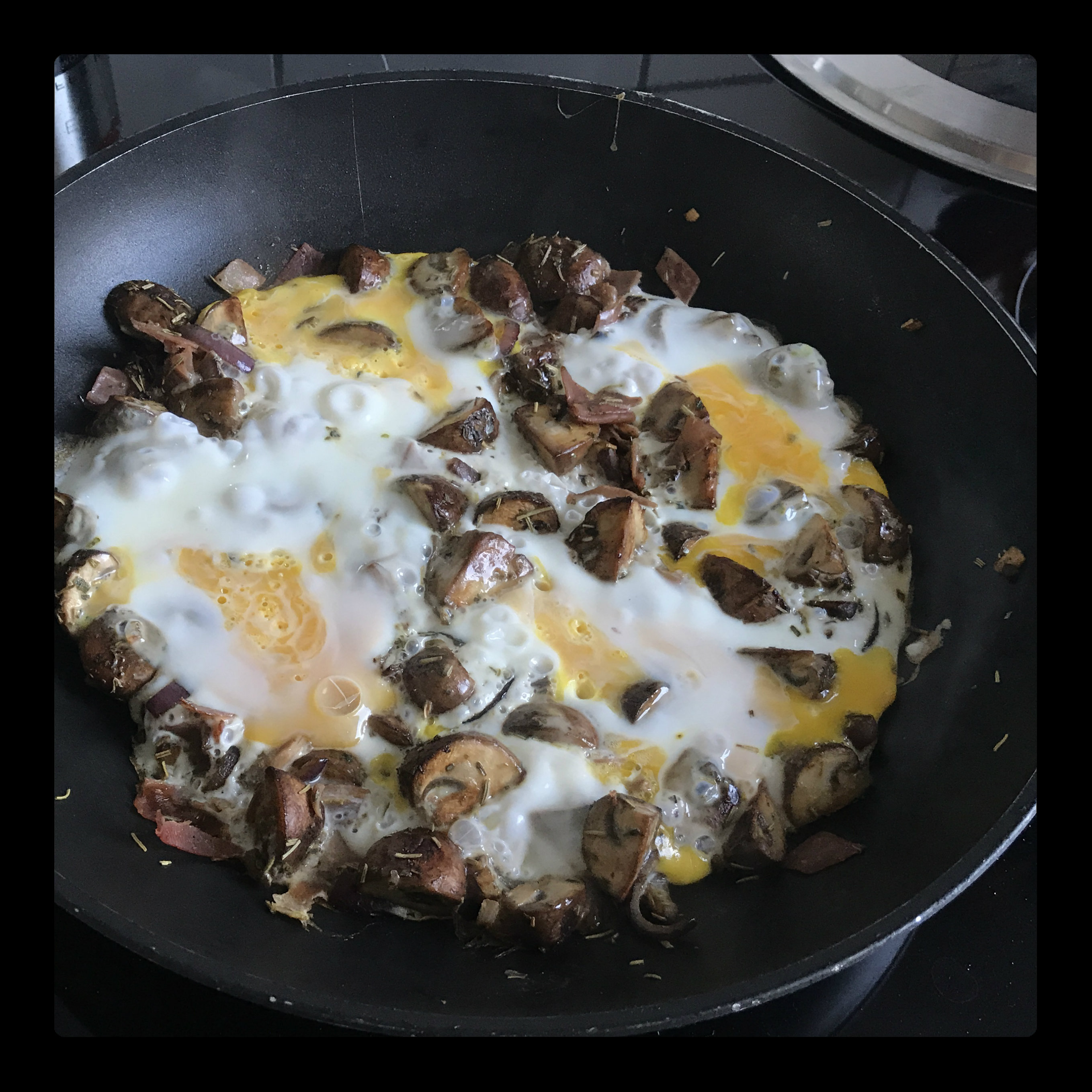 4 Eier (mögl. L) aus größerer Höhe auf das Gemüse klatschen lassen, die Pfanne mit dem Deckel schließen und die Eier in ca. 3 Min. stocken lassen, dann ggf. noch etwas