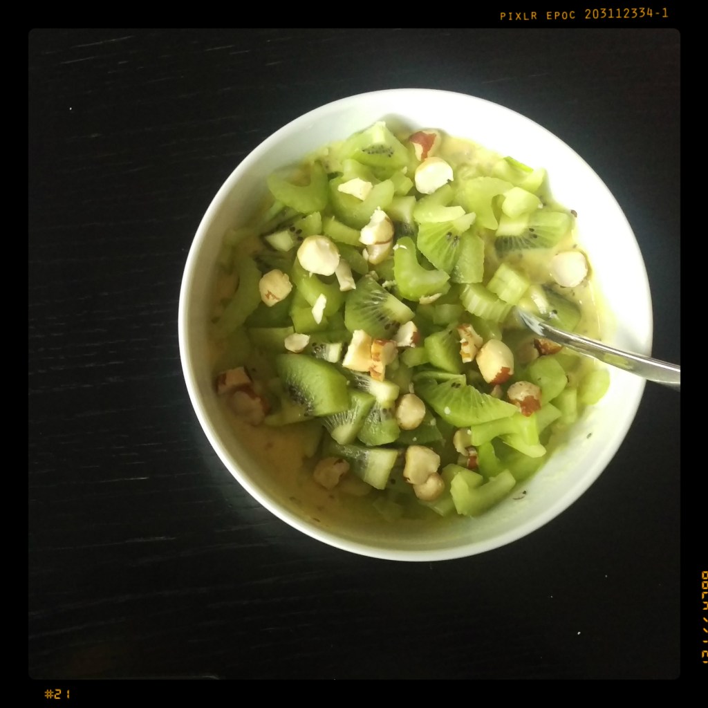 1 Kiwi (gewürfelt) darauf verteilen und mit