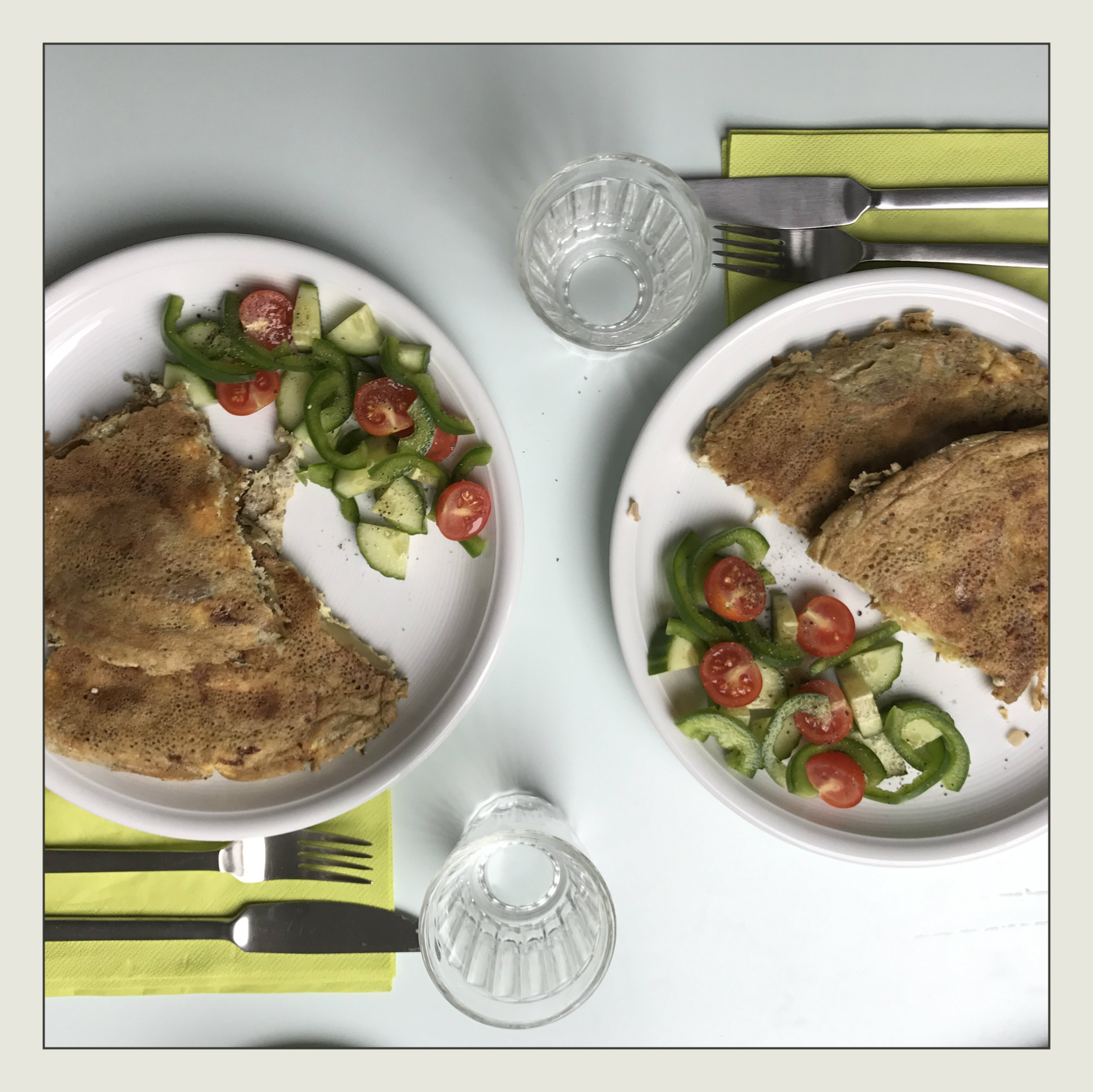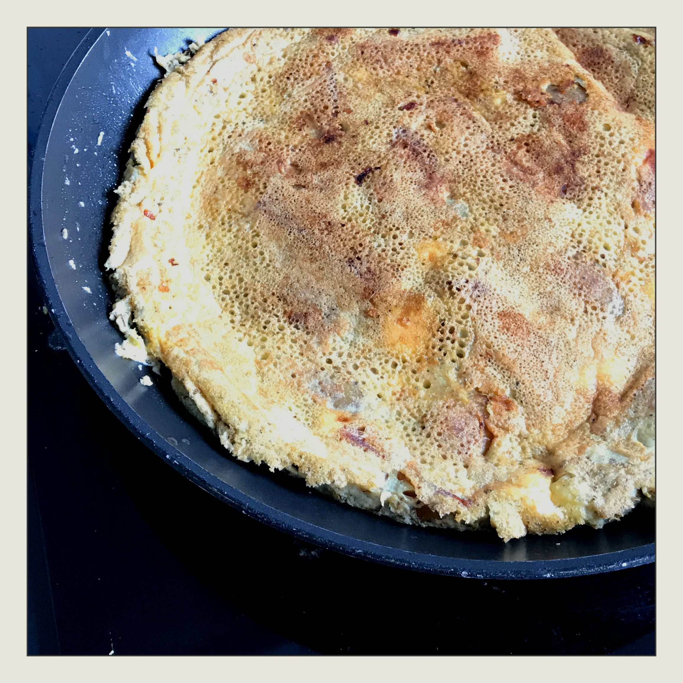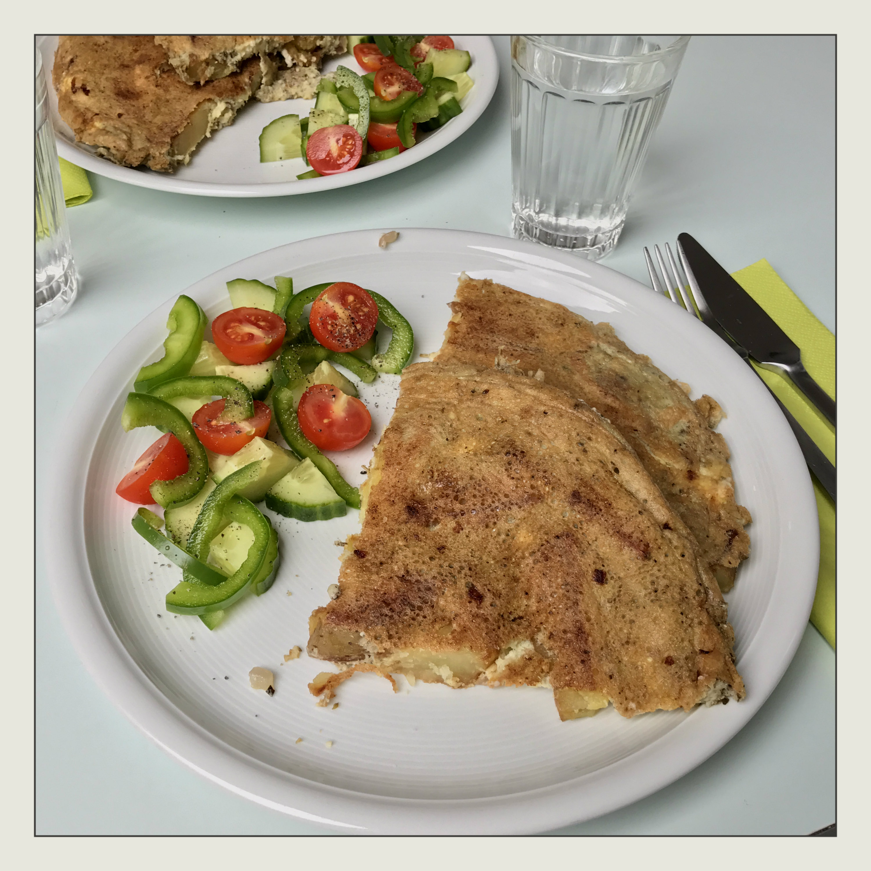 1 EL Bratolivenöl mittelstark erhitzen, soviel Eimasse in die Pfanne geben, dass der Boden bedeckt ist, dann Kartoffeln und Fetawürfel darüber verteilen und mit der restlichen Eimasse bedecken, die Pfanne sofort schließen, nach ca. 3 Minuten die Hitze auf mittelschwach reduzieren, wenn nach ca. 8 Min. die Oberfläche gestockt ist, das Omelette über den Deckel wenden und in