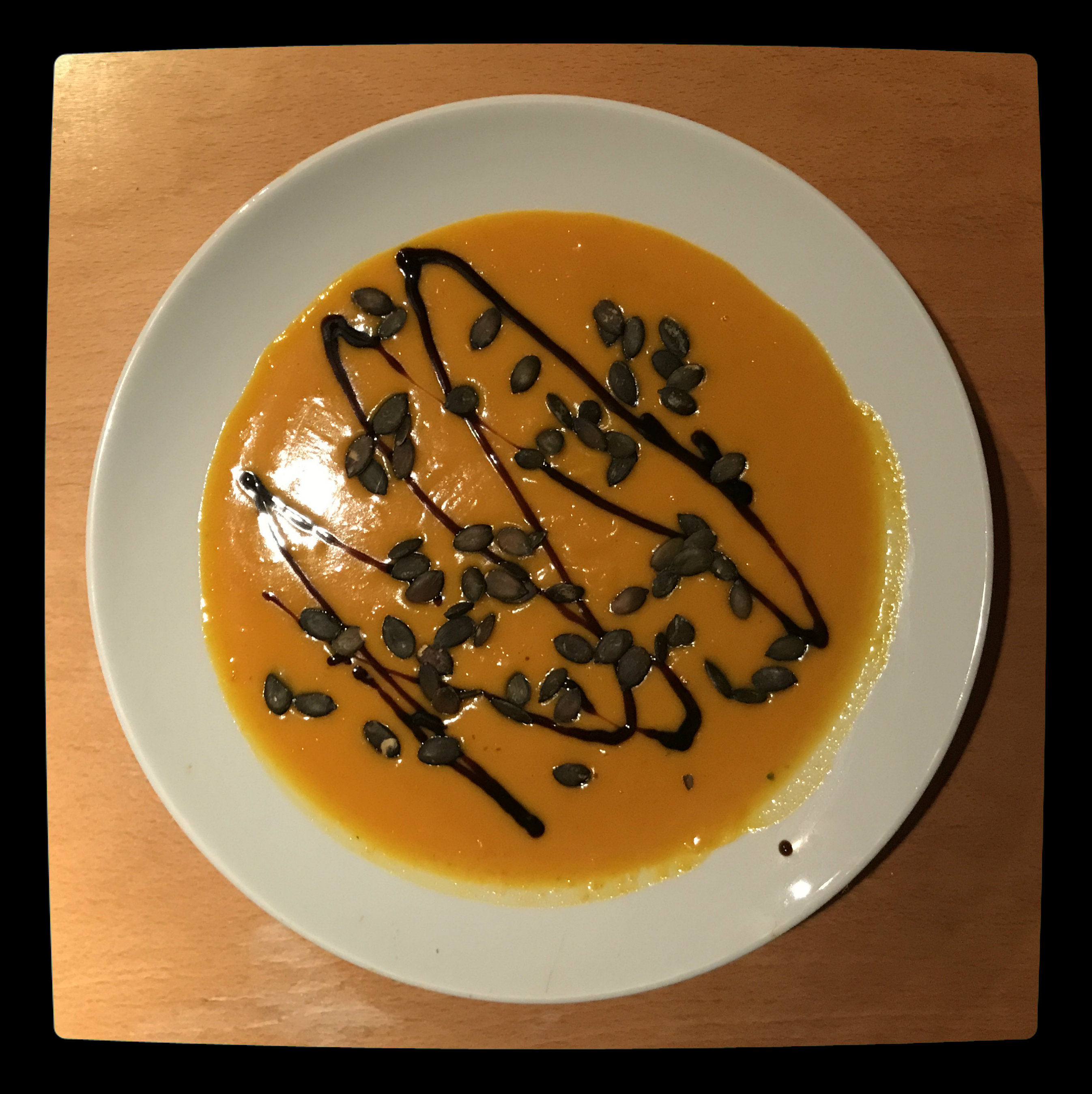 einige Spritzer Balsamico Crema darauf verteilen und die Kürbiskerne darüberstreuen
