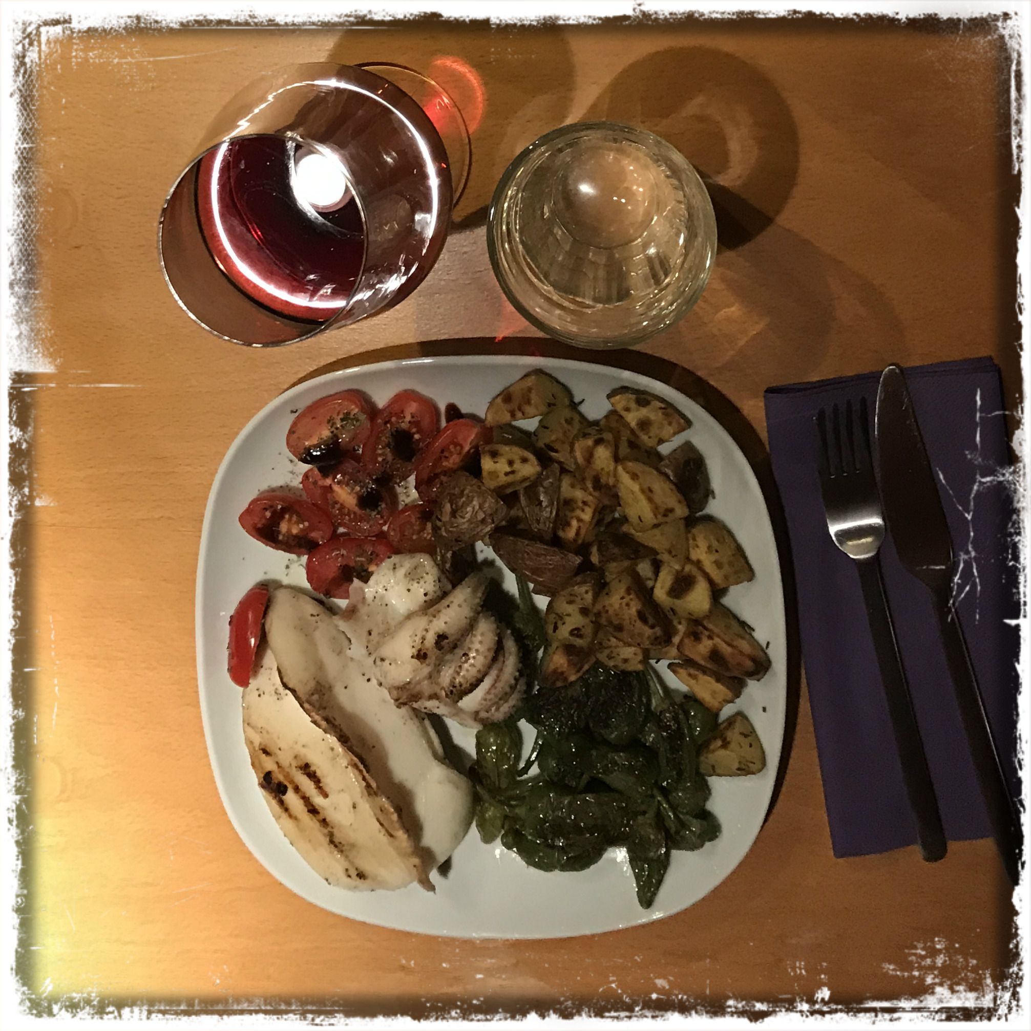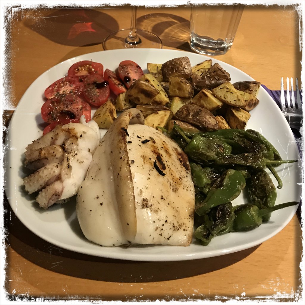 die Röstkartoffeln und Pimientos zu den Tomaten geben und mit dem Kalmar serviezen