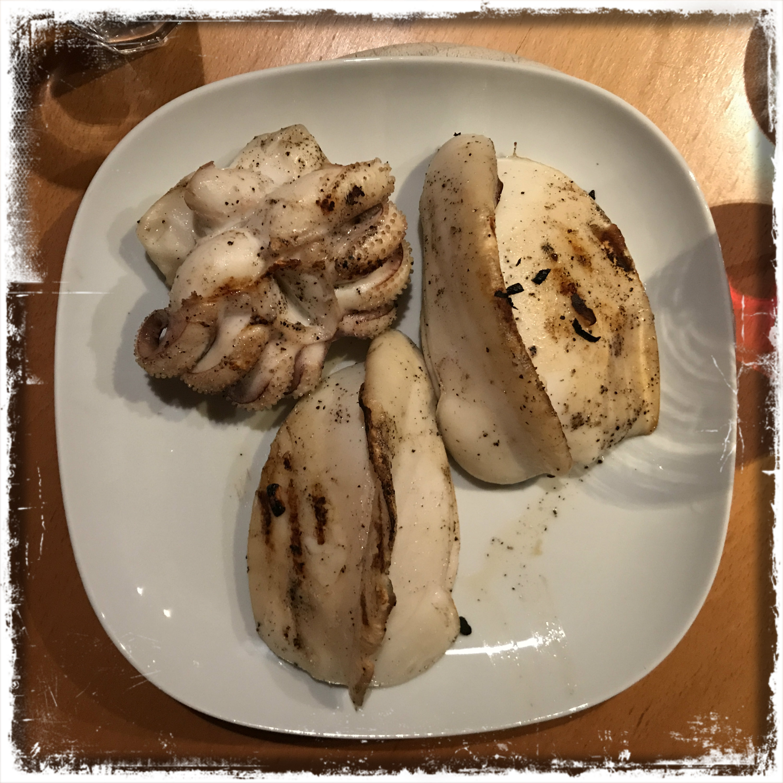 die Kalmar-Stücke auf den Grill geben und unter der Haube unter mehrfachem Wenden ca. 8 Min. grillen, außerdem