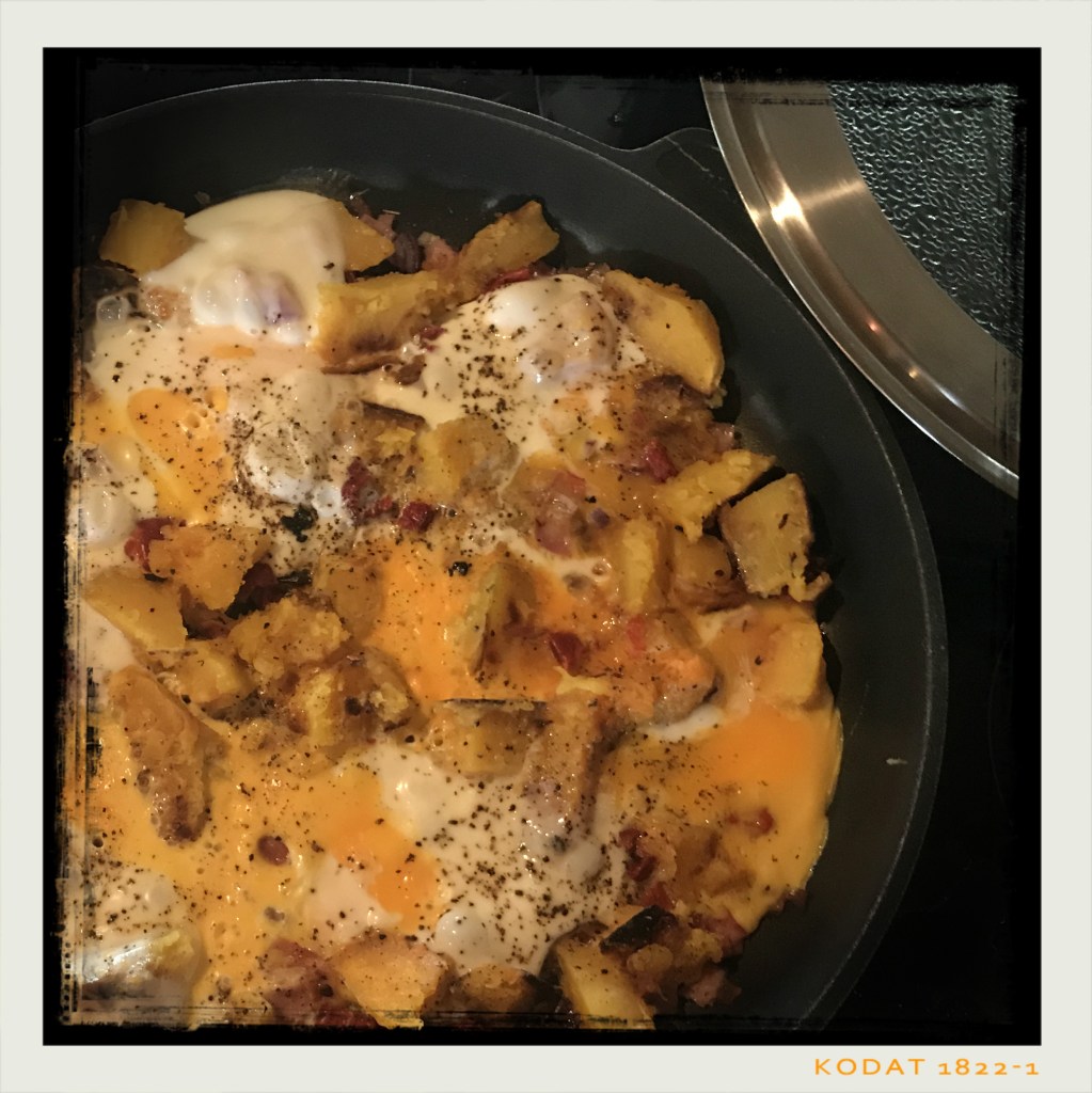 6 Eier (mögl. M) aus größerer Höhe auf das Butternut-Mischung klatschen lassen, die Pfanne mit dem Deckel schließen und die Eier in ca. 4 Min. stocken lassen, dann ggf. noch etwas