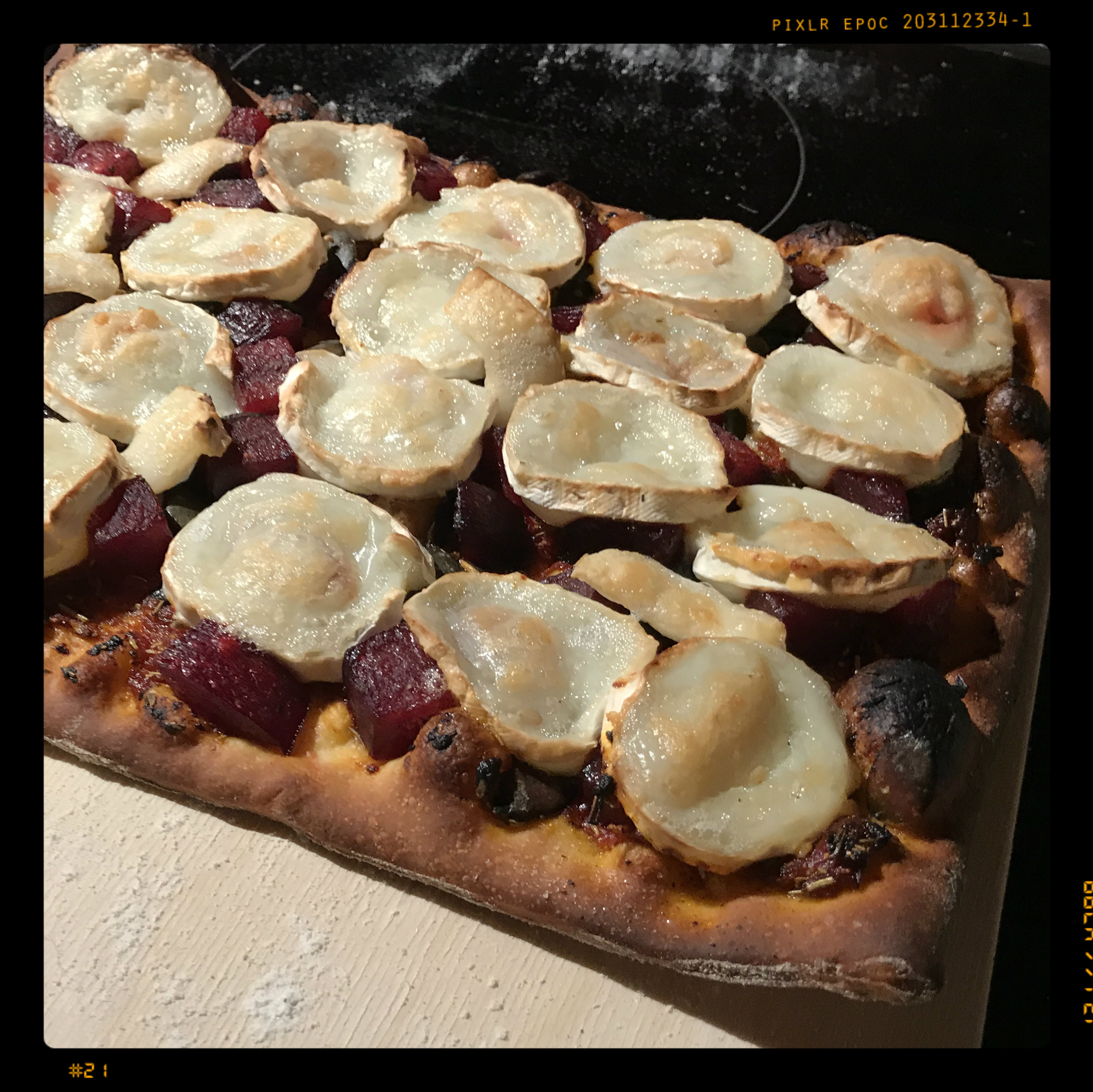 bemehlten Pizzaschieber mit der Tomatenmischung bestreichen, mit den roten Beten belegen und mit