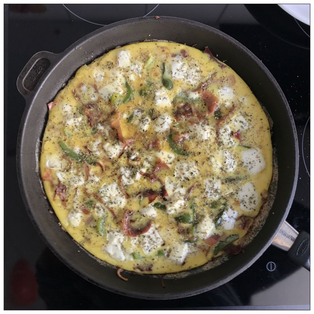 frisch gemahlener schwarzer Pfeffer mit dem Schneebesen schaumig schlagen, anschließend Gemüse und Schinken sowie die Fetawürfel untermischen