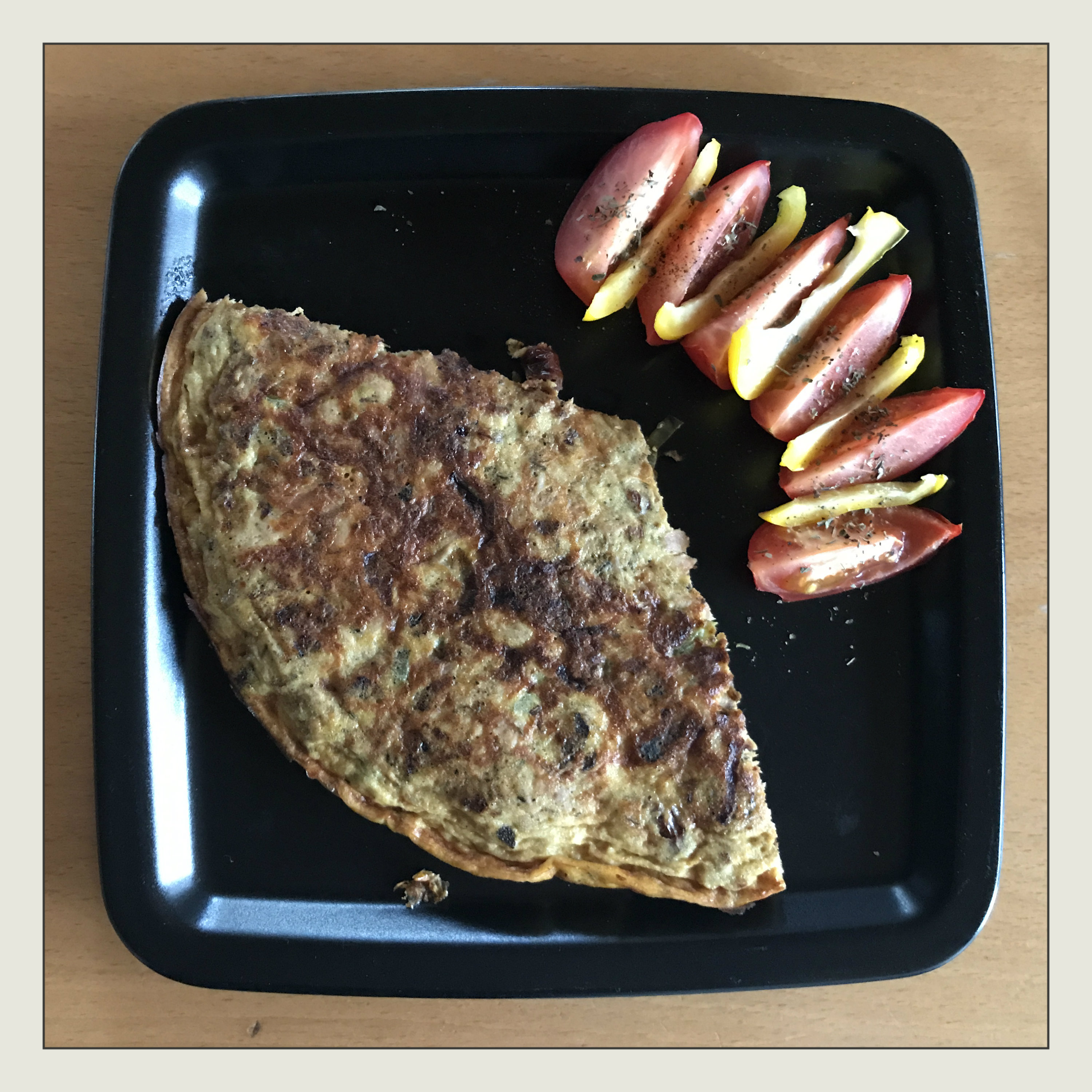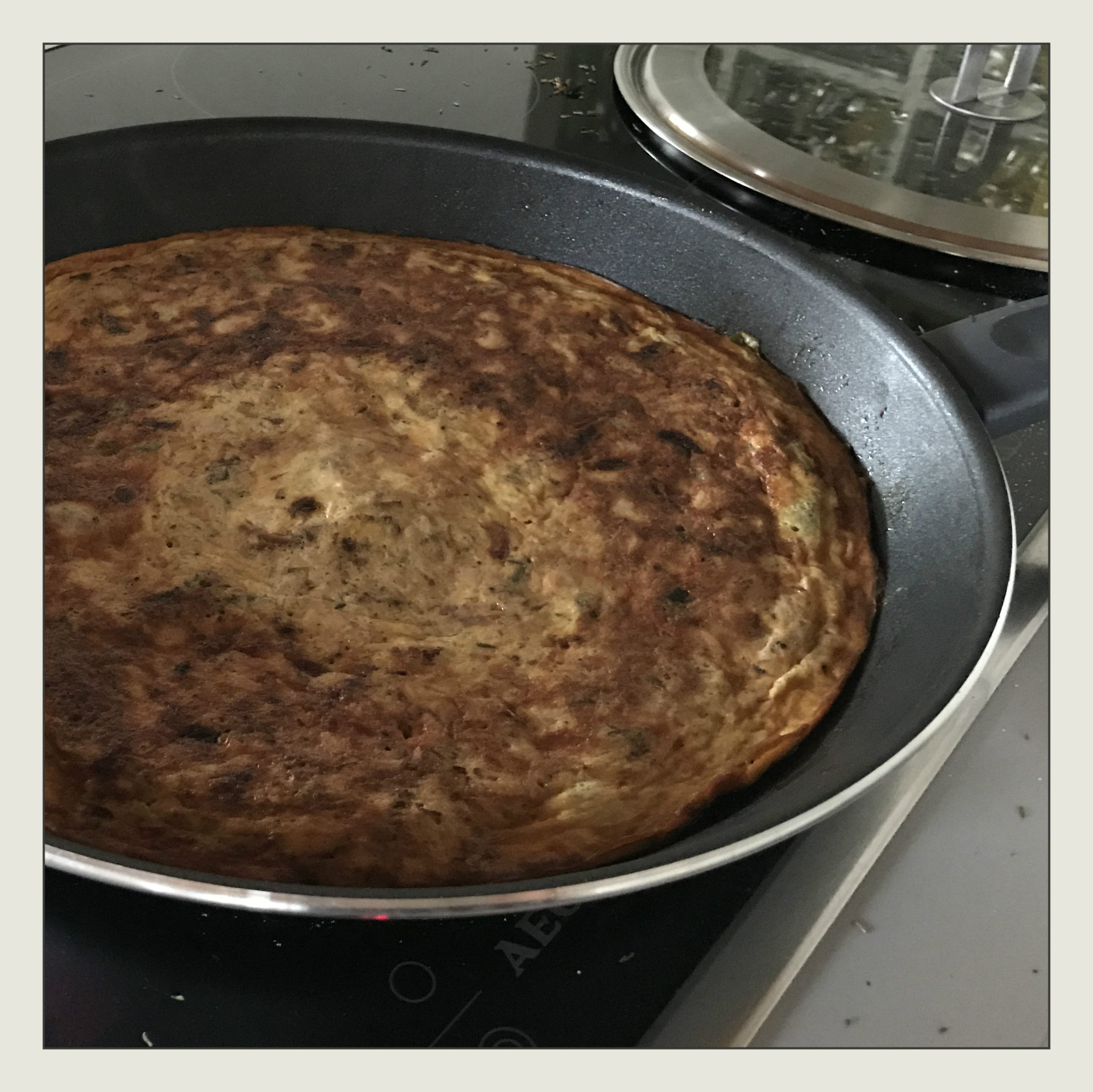 1 EL Brat-Olivenöl in der Pfanne mittelstark erhitzen, die Ei-Mischung hineingießen und die Pfanne sofort mit dem Deckel schließen, nach 4 Min. die Hitze auf mittelschwach reduzieren, etwa weitere 8 Min. garen, bis auch die Oberfläche gestockt ist, dann die Tortilla mit