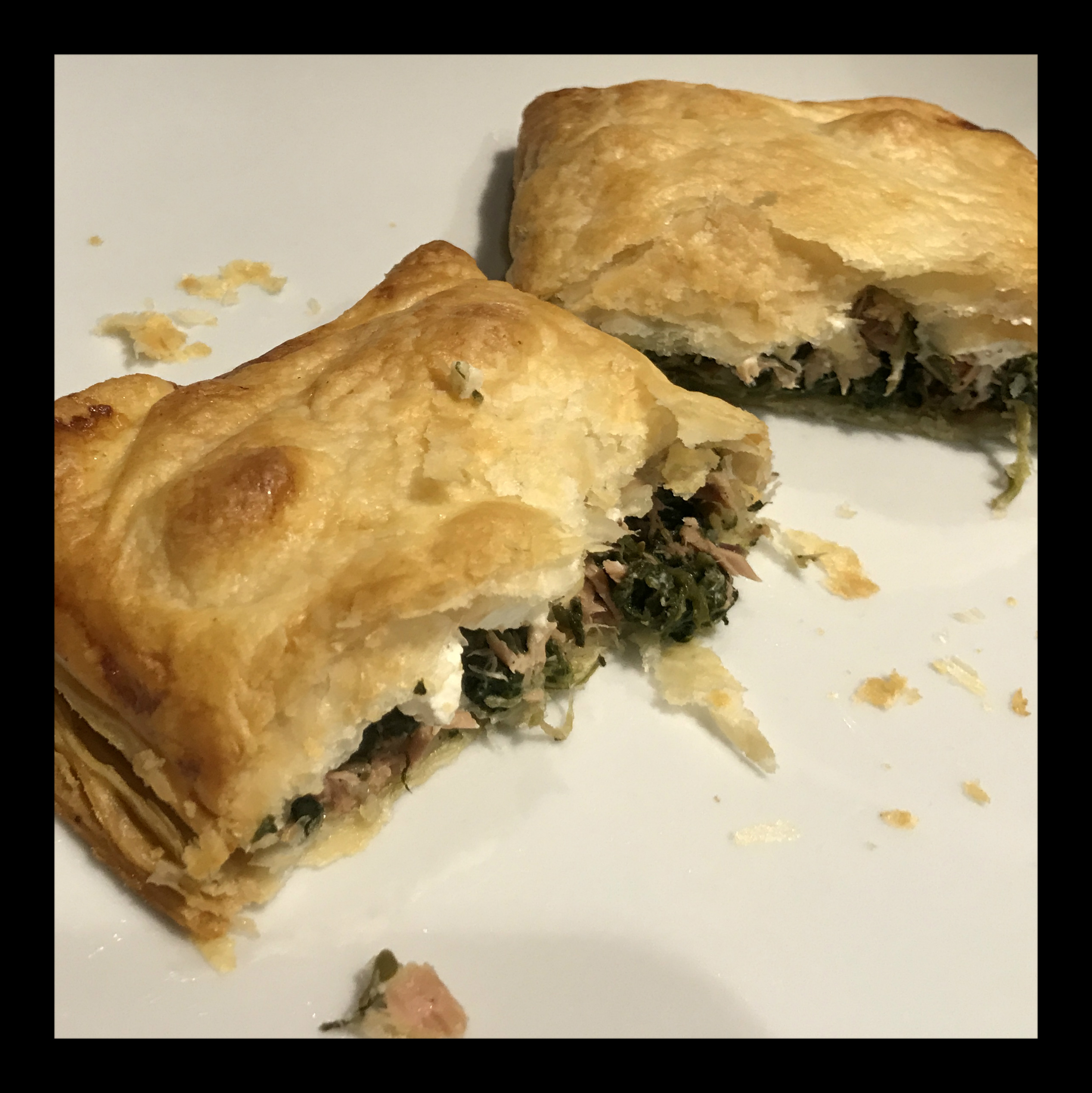 frisch gemahlenem schwarzen Pfeffer würzen, die Mischung je zur Hälfte in die Mitte der beiden Blätterteigstücke geben, die Ränder der Blätterteigstücke mit