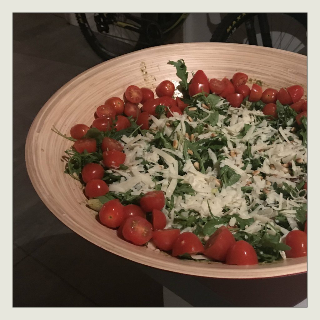 400 g Cherry-Datteltomaten (halbiert) drum herum legen und den Parmesan sowie die Pinienkerne über den Rucola streuen,