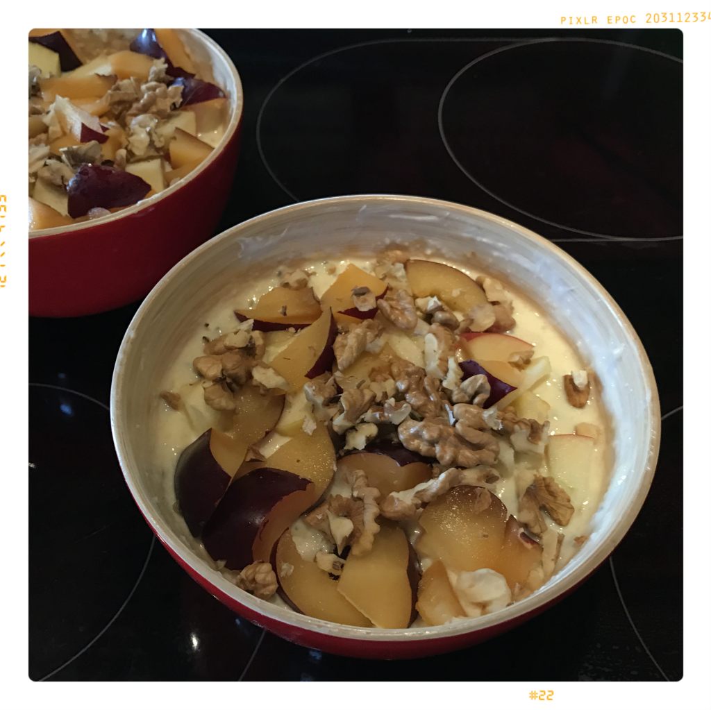1 Pflaume in kleine Stücke schneiden und auf den Joghurt geben, mit