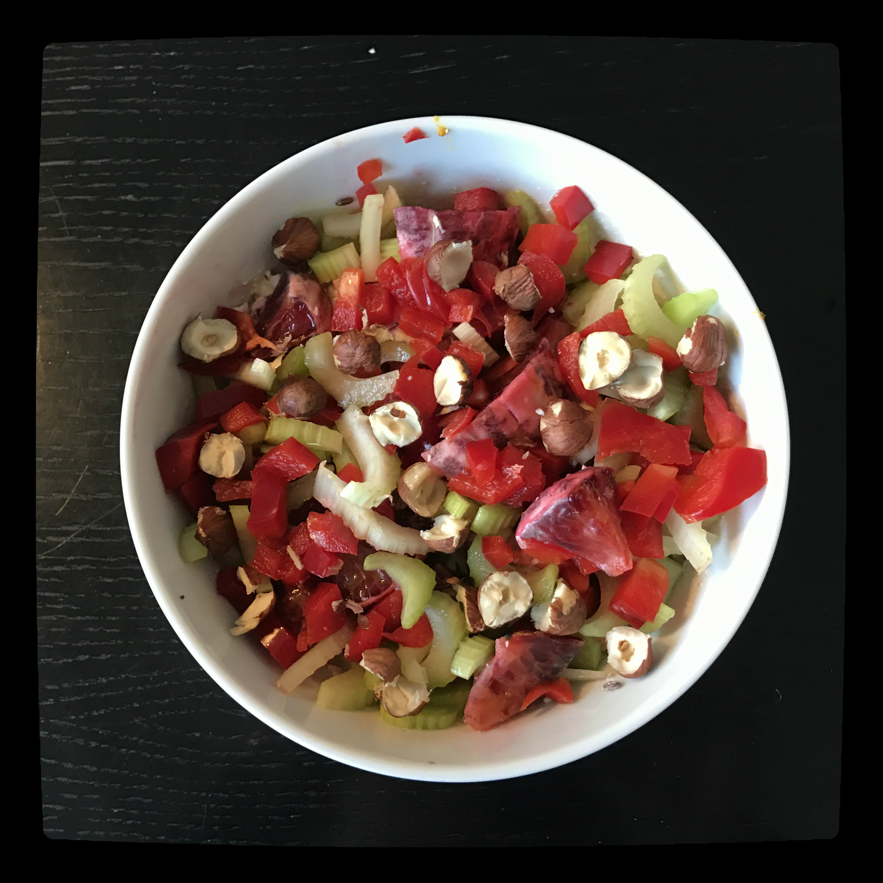 1 Halbblutorange in kleine Stücke schneiden, alles auf den Hüttenkäse geben und mit