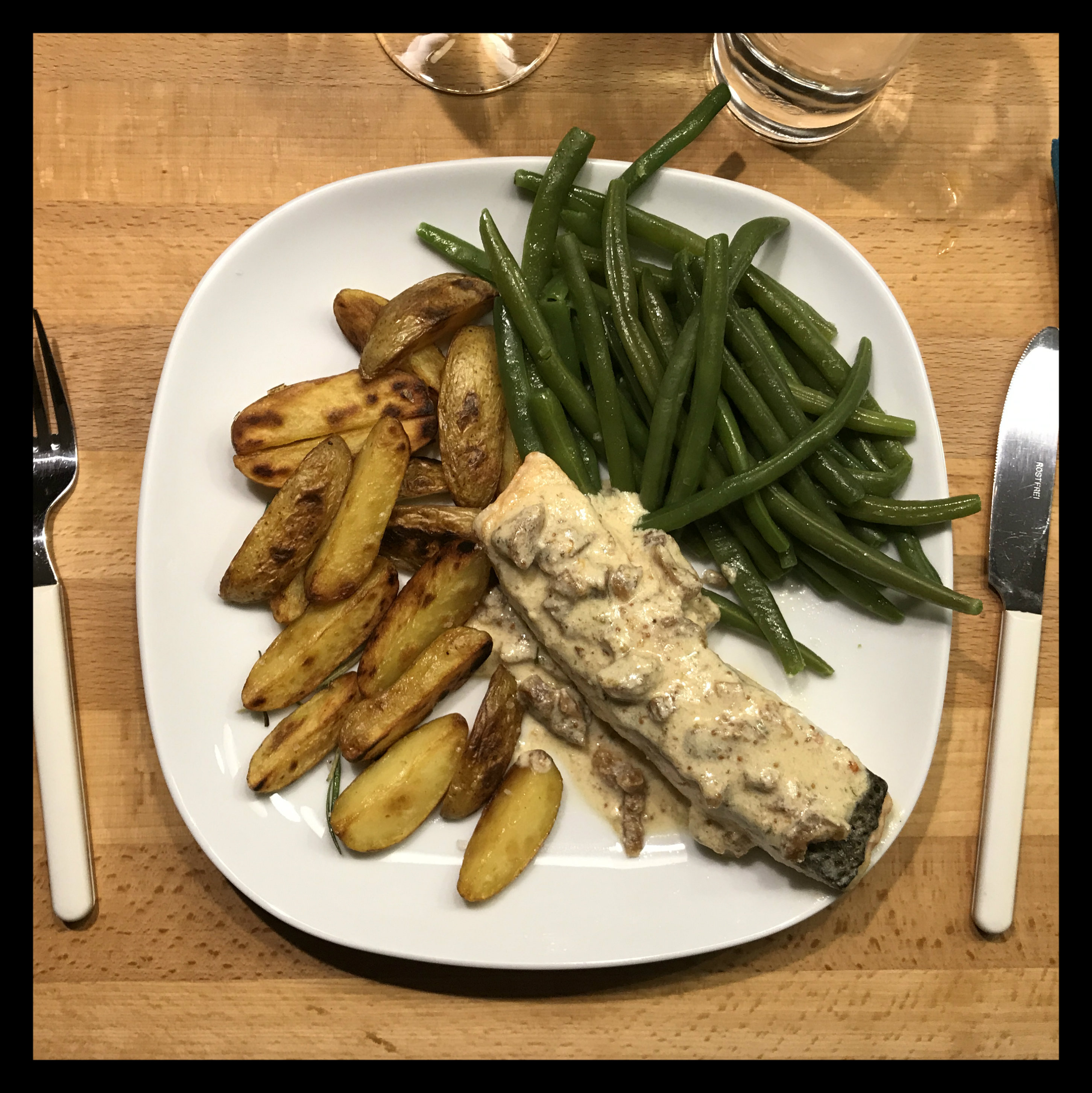 Bohnen, Röstkartoffeln und Lachs auf zwei vorgewärmten Tellern anrichten und die Feigensauce über den Lachs geben