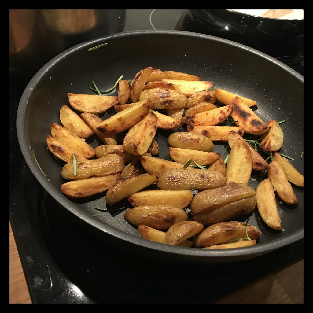 den Rosmarin zu den Kartoffeln geben und diese noch etwa fünf Minuten ohne Deckel weiter rösten