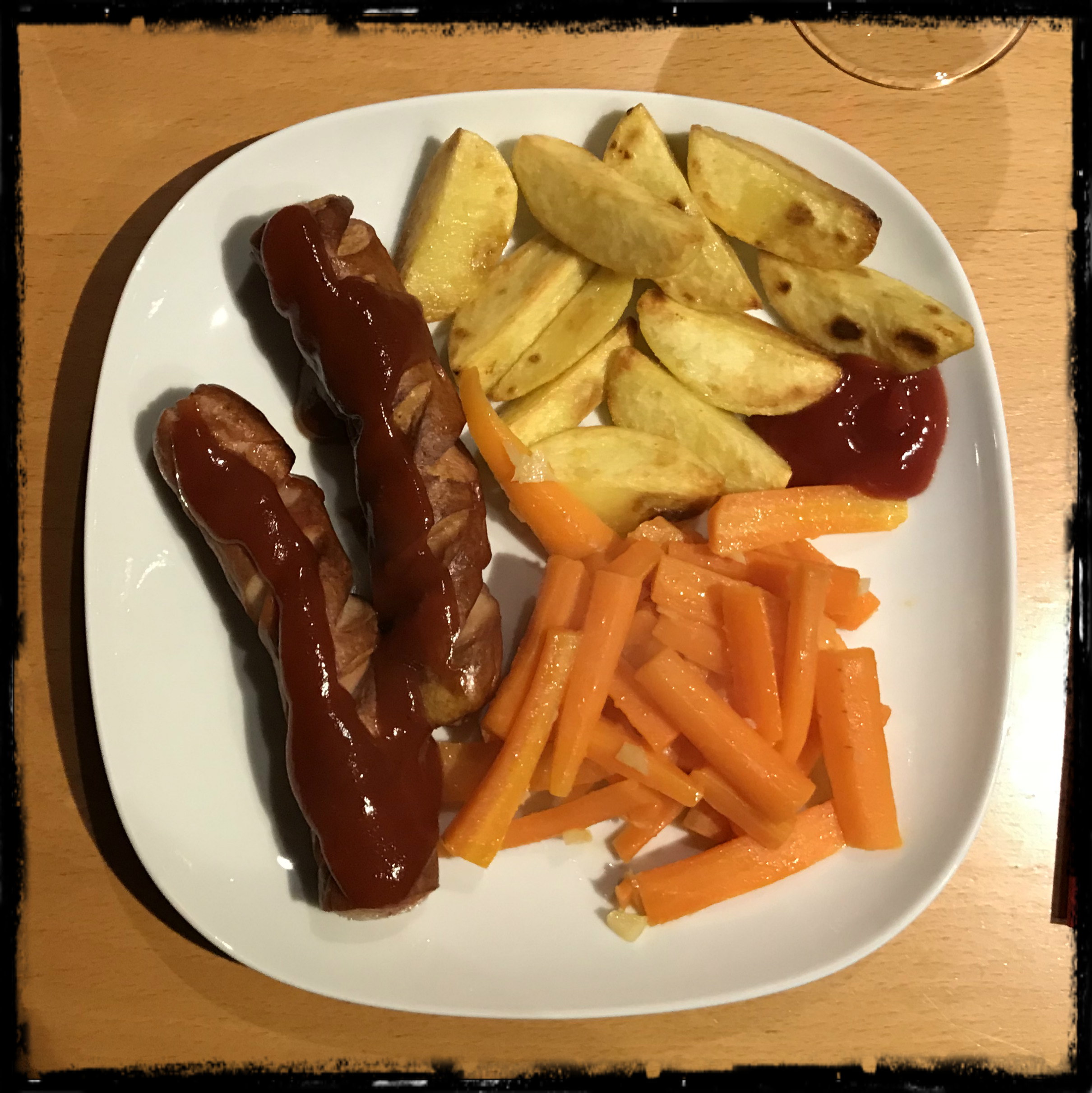 die Currywürste mit den Knoblauchmöhren, Röstkartoffeln und