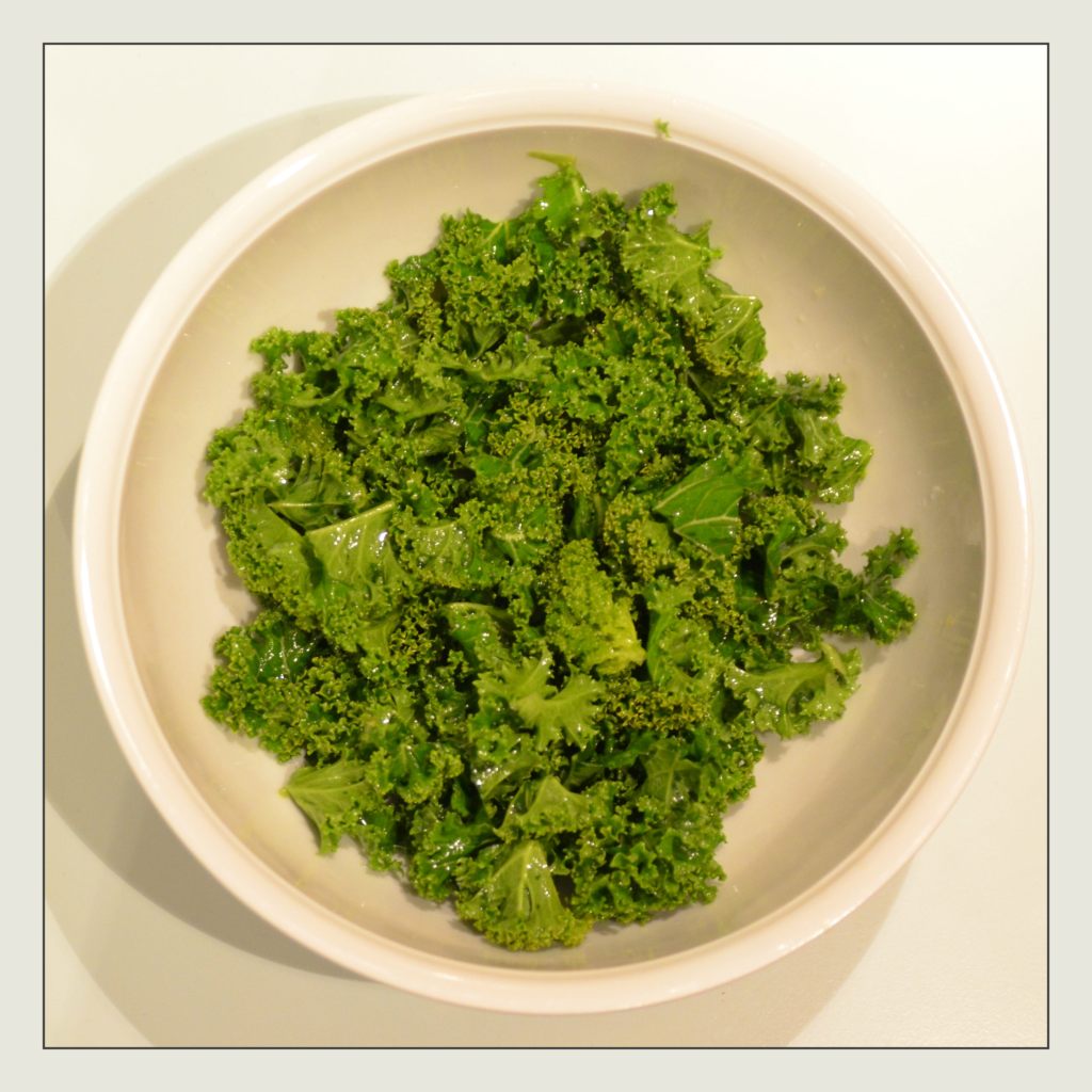 etwa 4 – 6 Blättern Grünkohl den feinen kräuseligen Rand abzupfen und