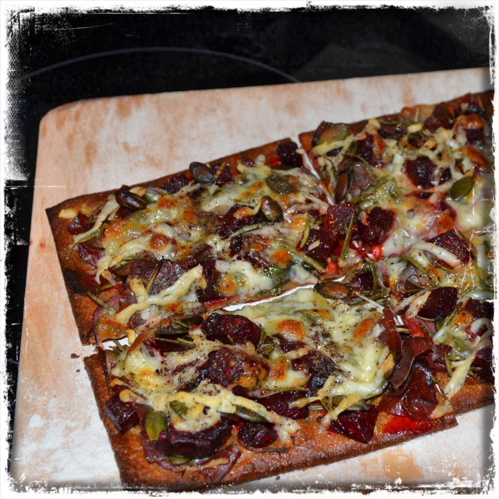 die vorgebackene Lizza umdrehen und nacheinander mit den roten Beten, dem Bündner Fleisch, dem Rosmarin, Pecorino und Mozzarella belegen, mit