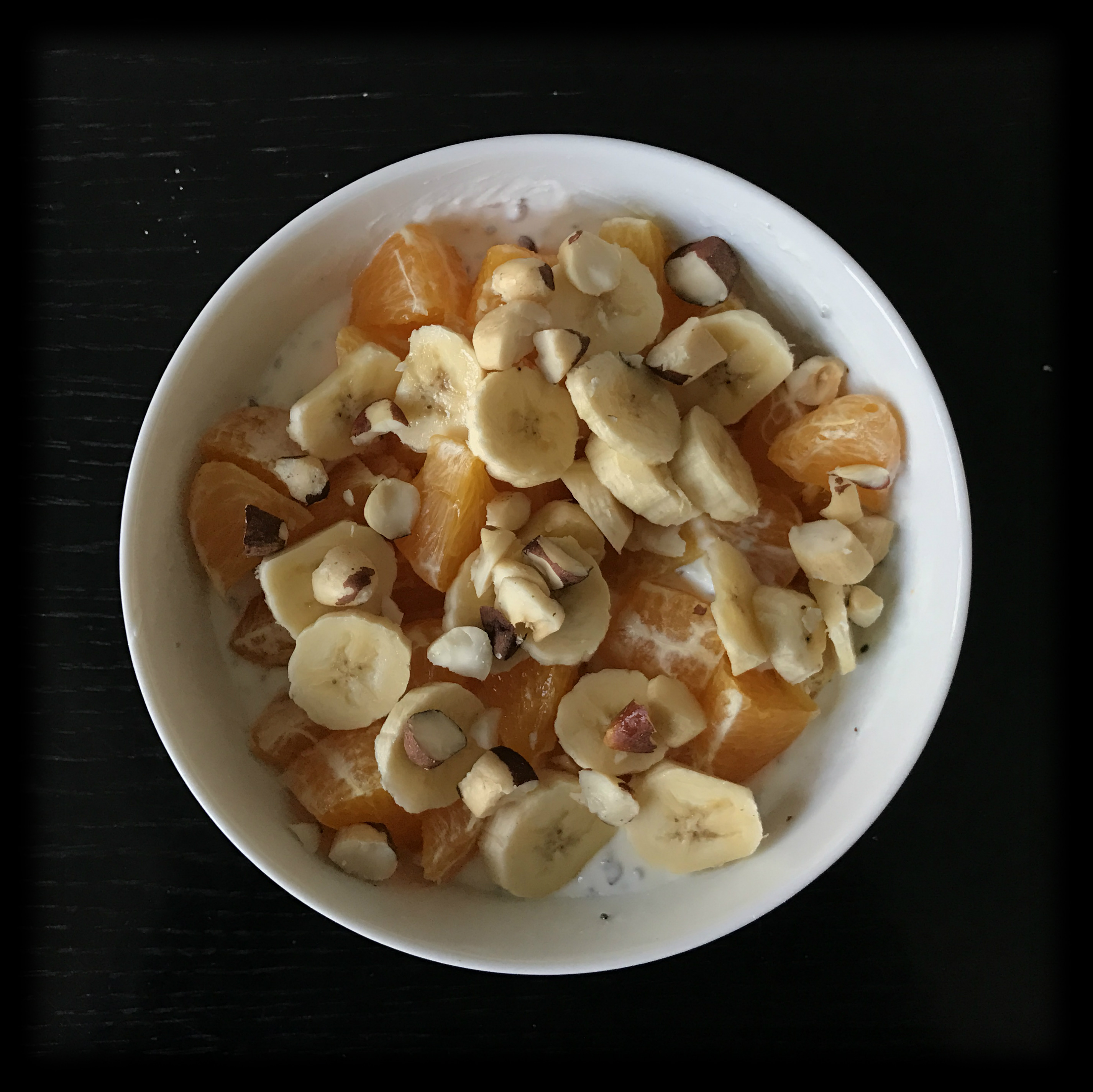 1 sehr kl. Banane (oder eine halben – in dünne Scheiben geschnitten) auf dem Quark verteilen, dann mit