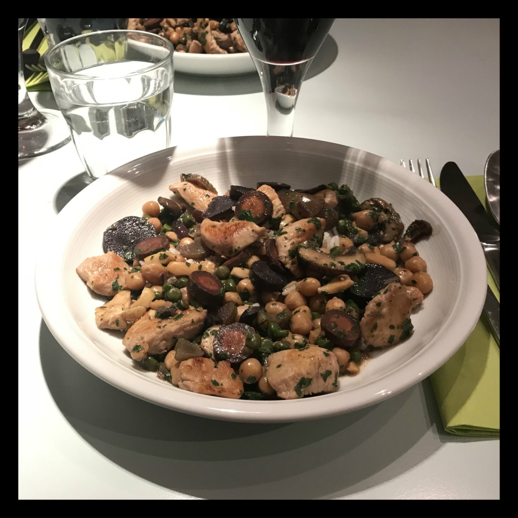 200 ml Kokosmilch, die Fleischstücke und die Kichererbsen dazugeben und einmal kurz aufkochen lassen, dann bei milder Hitze etwa 5 Min. ziehen lassen, derweil