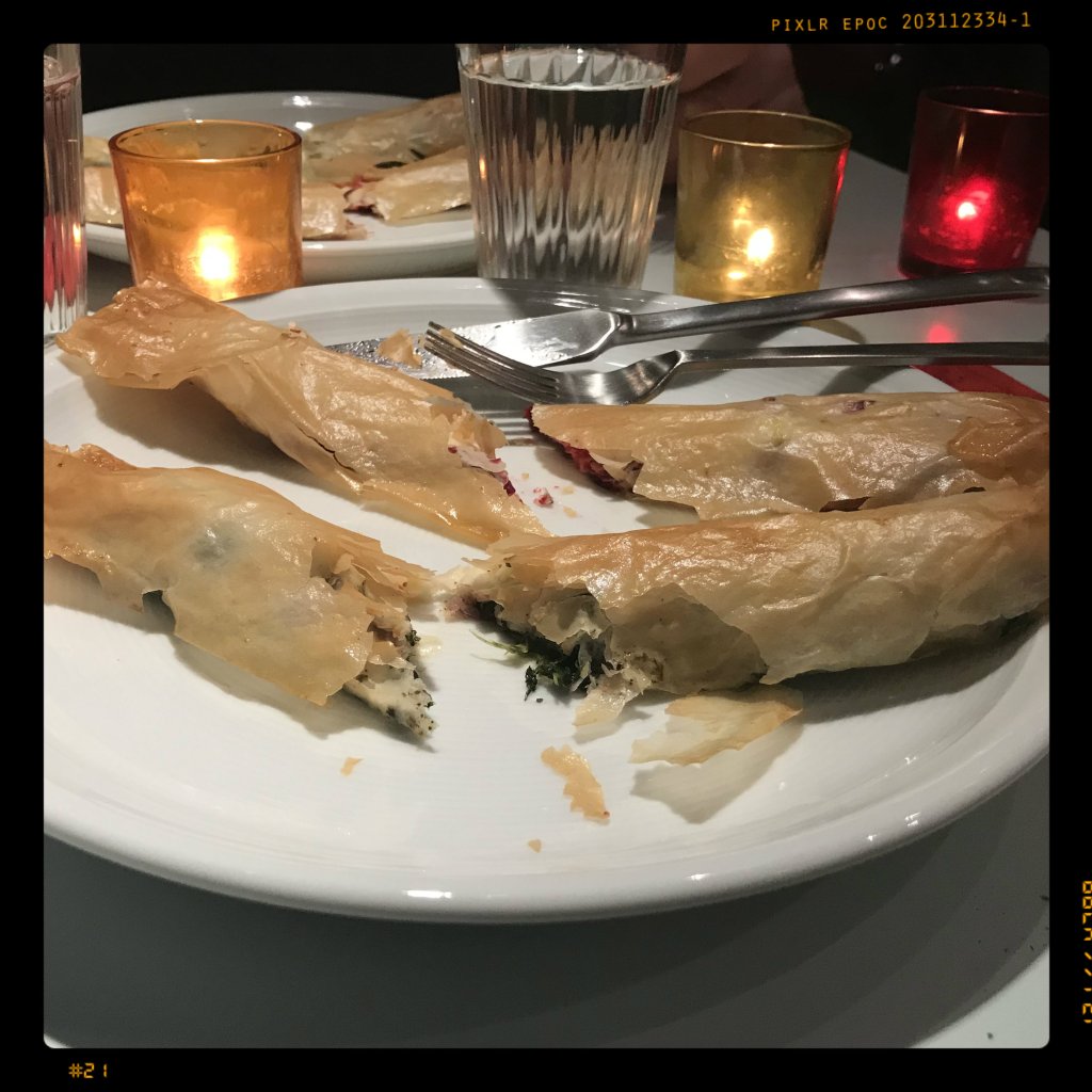 griechische TK-Filo-Teigblätter (z. B. von Kanaki), diese bereits mindestens zwei Stunden vorher auftauen lassen, dabei in der Folienverpackung belassen, sie dürfen nicht austrocknen – die 450 g Packung enthält etwa 10 Blätter, das reicht für 20 zarte Rollen oder 10 dicke Rollen