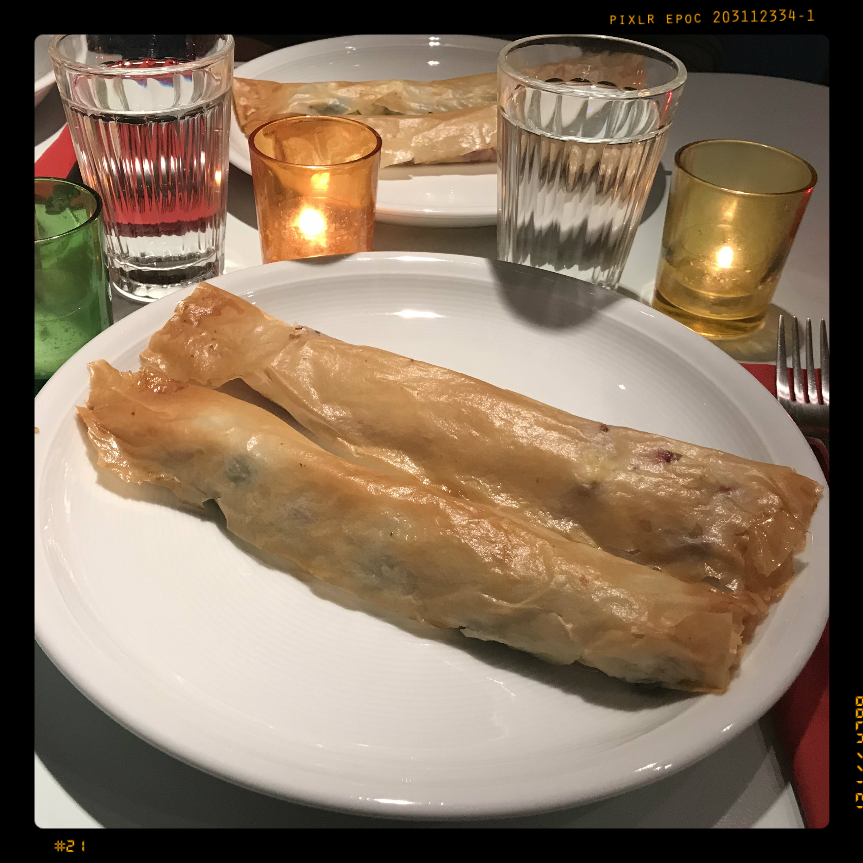 griechische TK-Filo-Teigblätter (z. B. von Kanaki), diese bereits mindestens zwei Stunden vorher auftauen lassen, dabei in der Folienverpackung belassen, sie dürfen nicht austrocknen – die 450 g Packung enthält etwa 10 Blätter, das reicht für 20 zarte Rollen oder 10 dicke Rollen