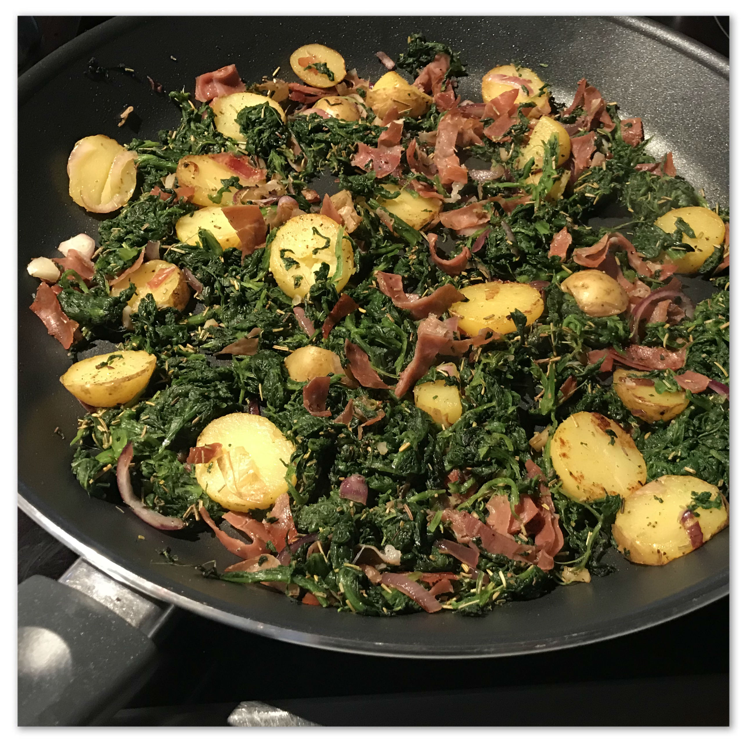 die Kartoffeln mit dem Schinken und den Zwiebeln in