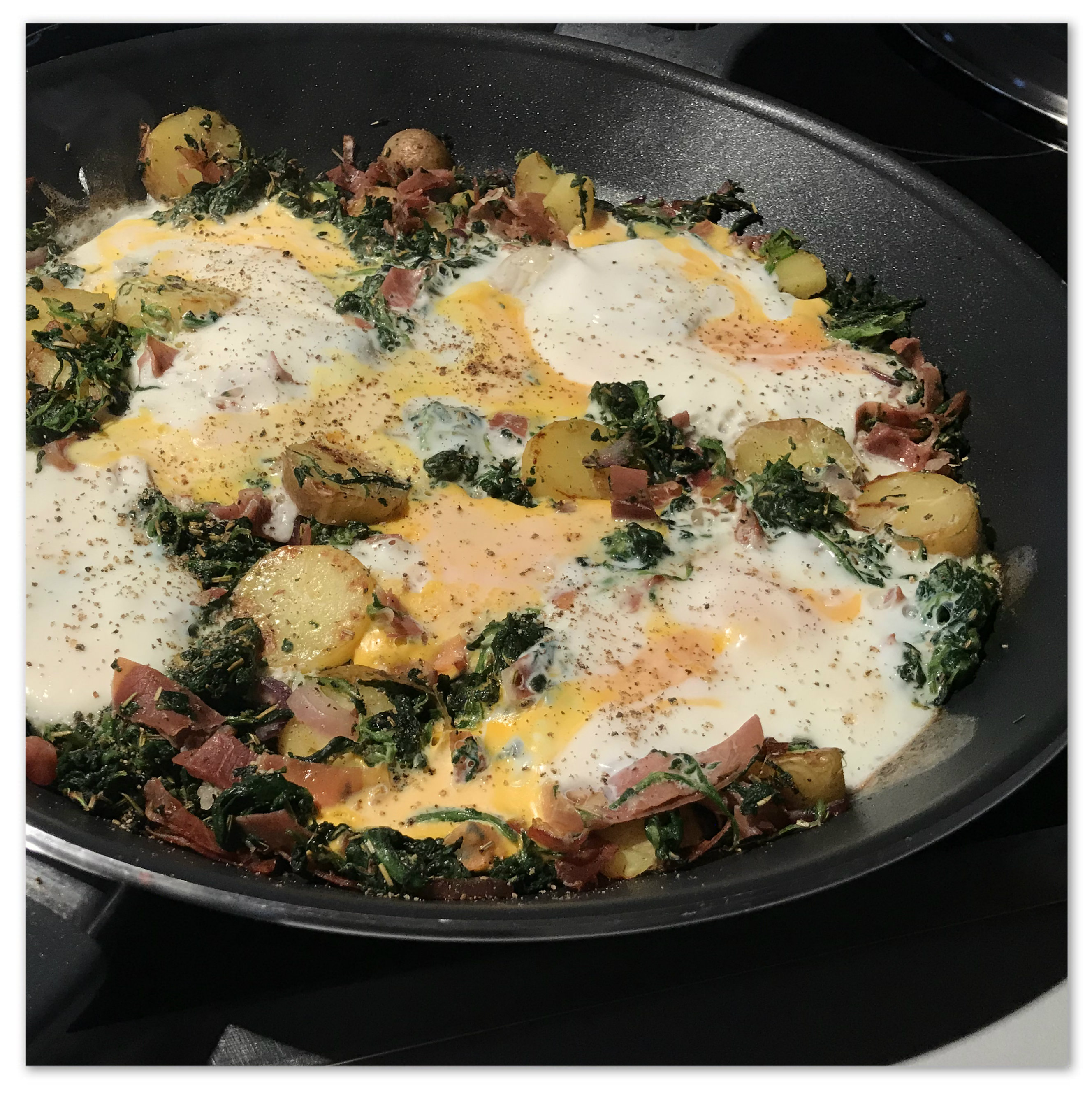 6 Eier (mögl. M) aus größerer Höhe auf die Gemüsemischung klatschen lassen, die Pfanne mit dem Deckel schließen und die Eier in ca. 3 Min. stocken lassen, dann noch etwas