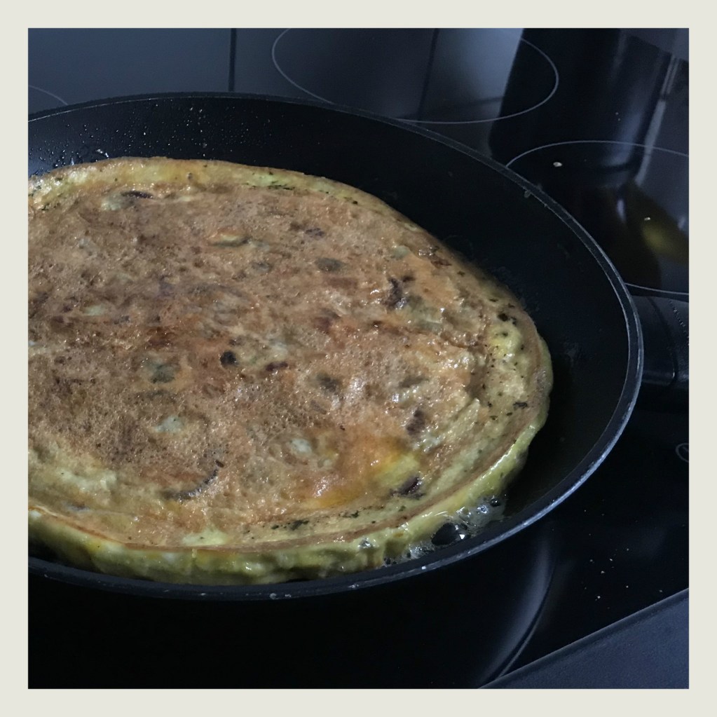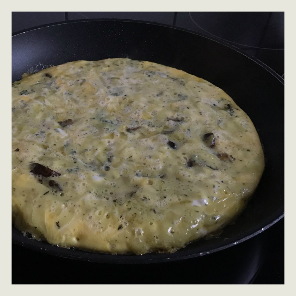 1 EL Bratolivenöl mittelstark erhitzen, soviel Eimasse in die Pfanne geben, dass der Boden bedeckt ist, dann die Champignonmischung darüber verteilen und mit der restlichen Eimasse bedecken, die Pfanne sofort schließen und ca. 3 Minuten braten, derweil
