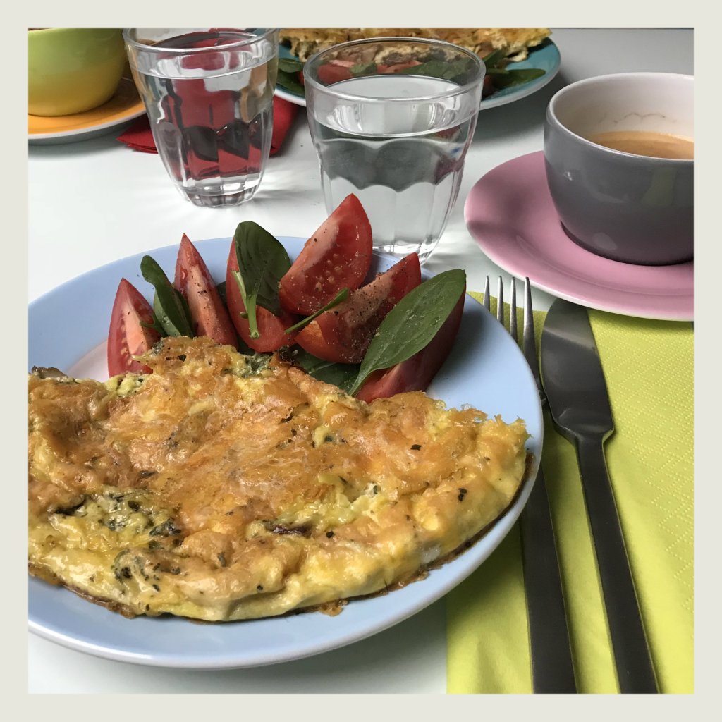 die Hitze auf mittelschwach reduzieren, den Käse auf dem Omelette verteilen und wenn nach ca. 8 Min. die Oberfläche gestockt ist, das Omelette über den Deckel wenden und in