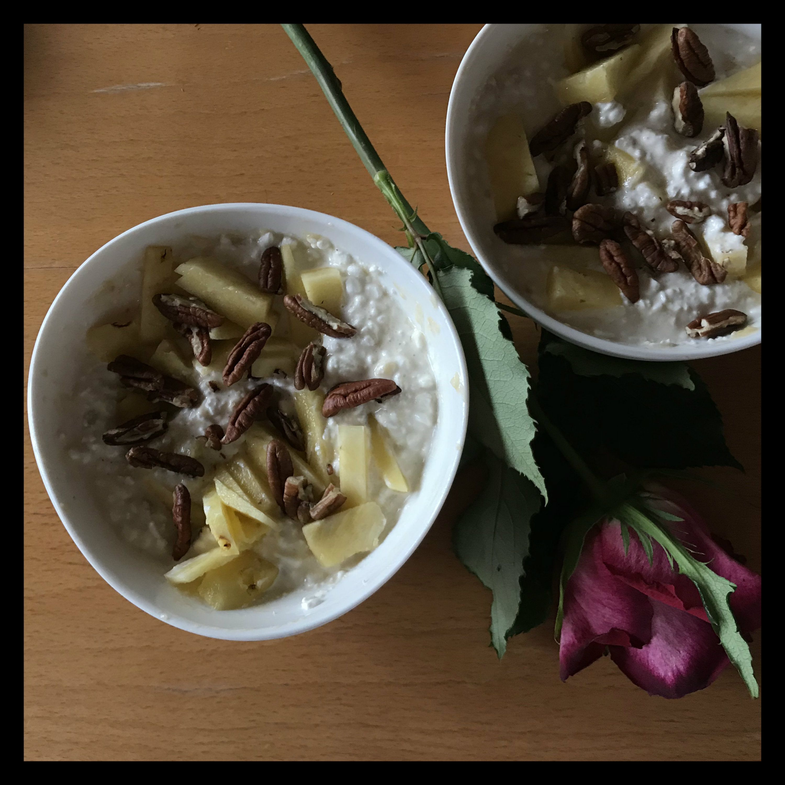 1 Scheibe Ananas (ca. 1 cm dick) in kleine Stücke schneiden und auf den Hüttenkäse geben, dann mit