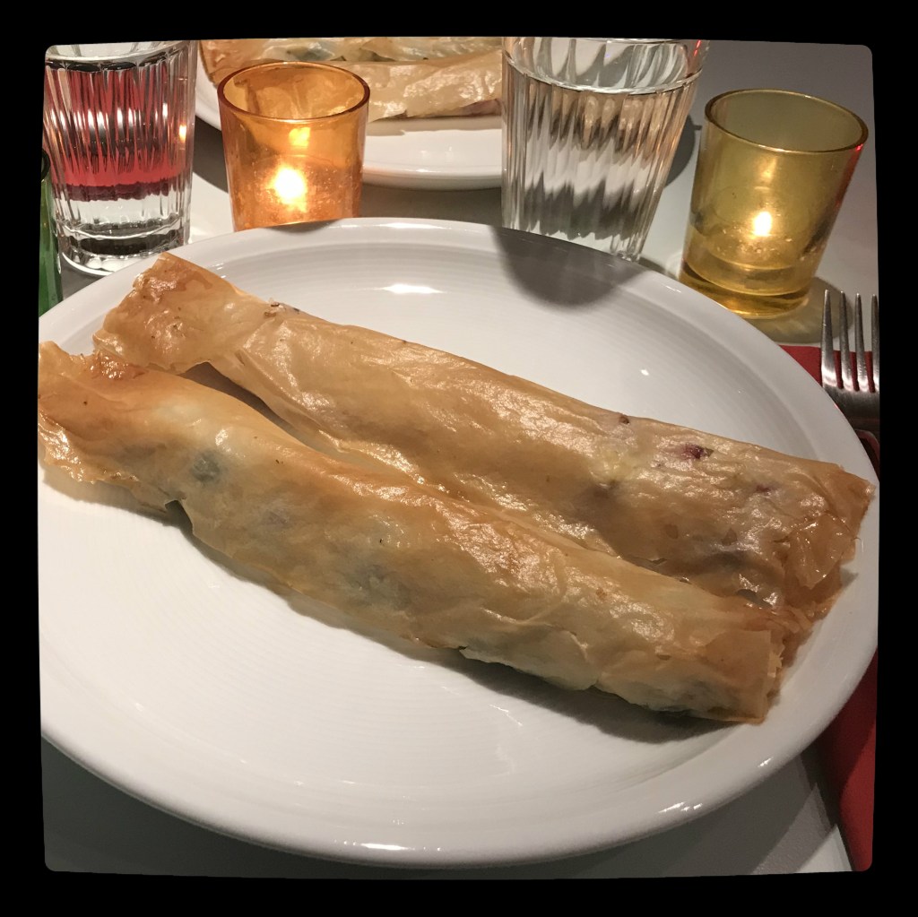 griechische TK-Filo-Teigblätter (z. B. von Kanaki), diese bereits mindestens zwei Stunden vorher auftauen lassen, dabei in der Folienverpackung belassen, sie dürfen nicht austrocknen – die 450 g Packung enthält etwa 10 Blätter, das reicht für 20 zarte Rollen oder 10 dicke Rollen