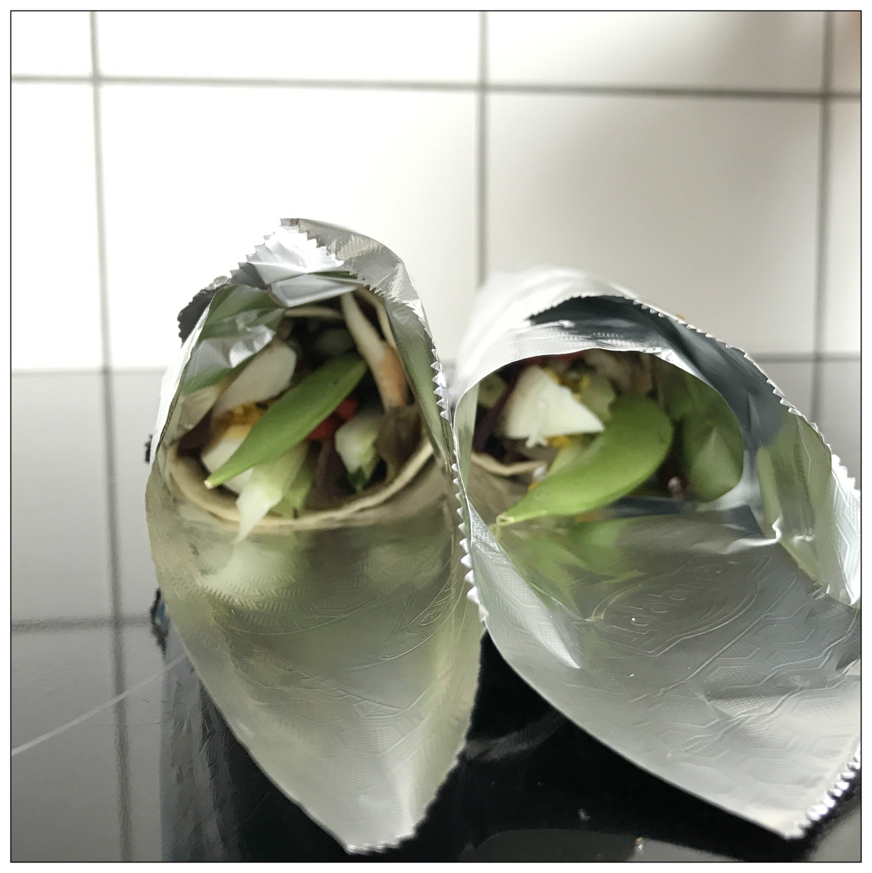 frisch gemahlenem schwarzen Pfeffer würzen, zu zwei Wraps fest zusammenrollen und einzeln in