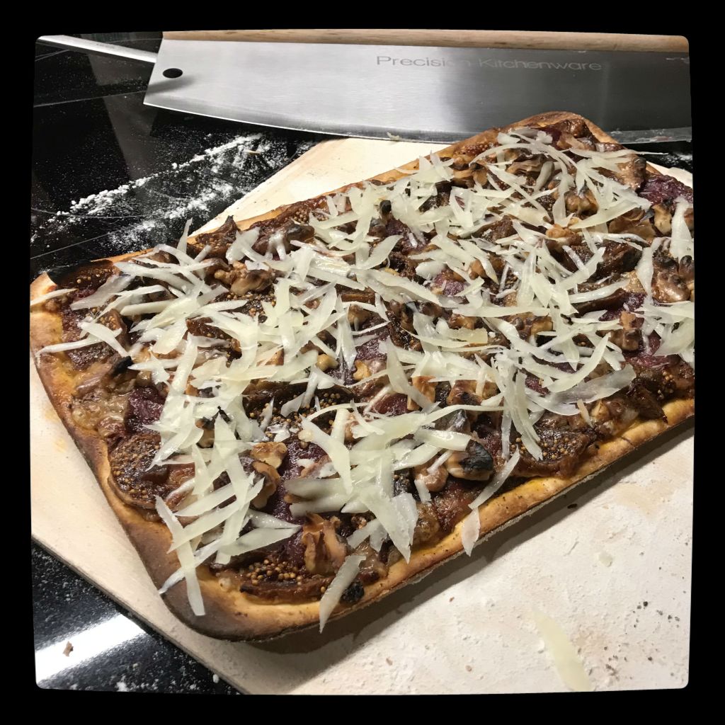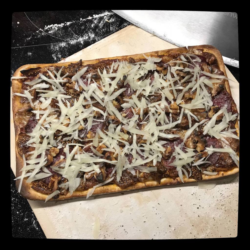 bemehlten Pizzaschieber mit der Tomatensauce bestreichen, zuerst den Emmentaler darauf verteilen, dann mit den Salamischeiben, Feigenstreifen und