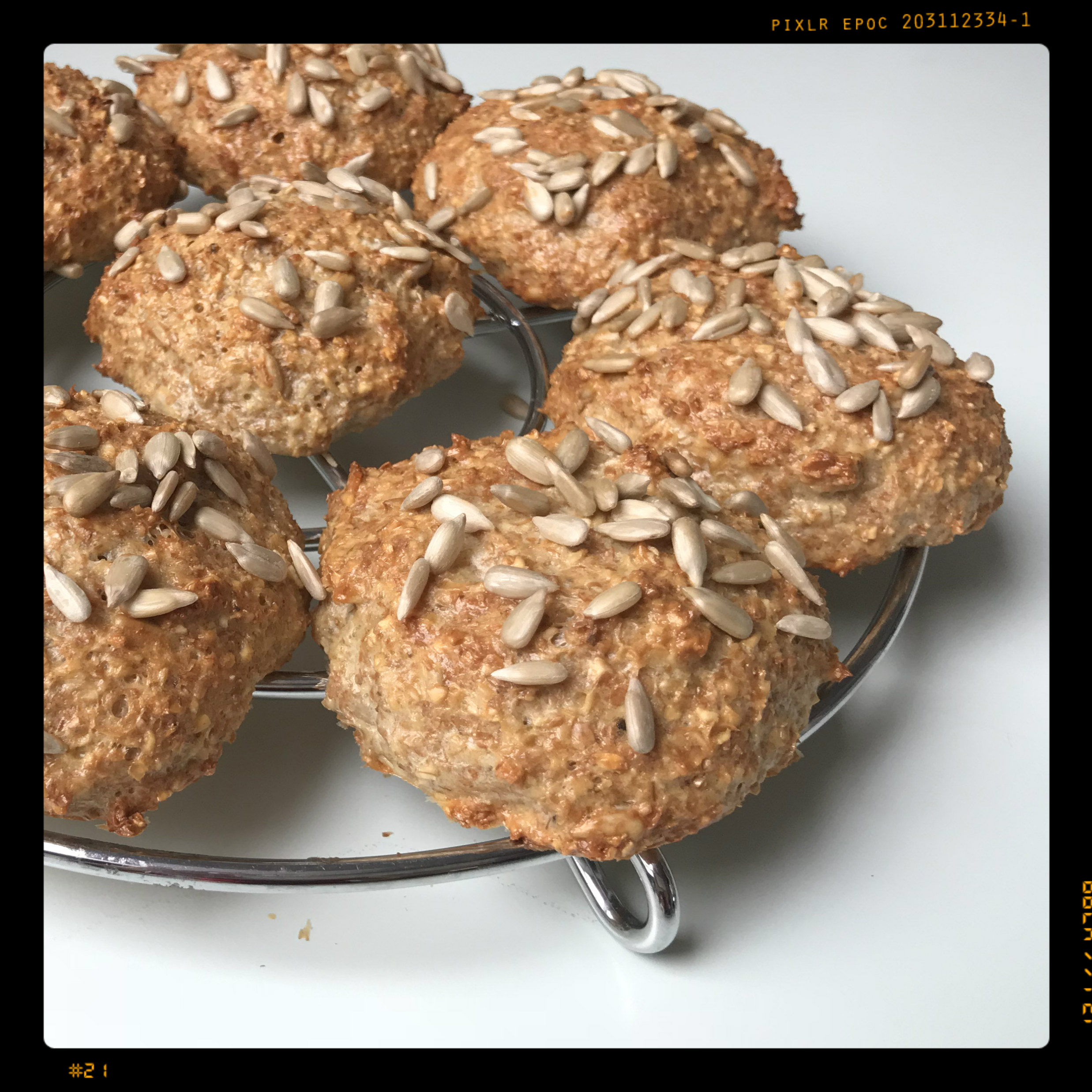 25 g Sonnenblumenkernen unter die Teigmasse mischen, daraus mir nassen Händen etwa 8 Bällchen formen, mit