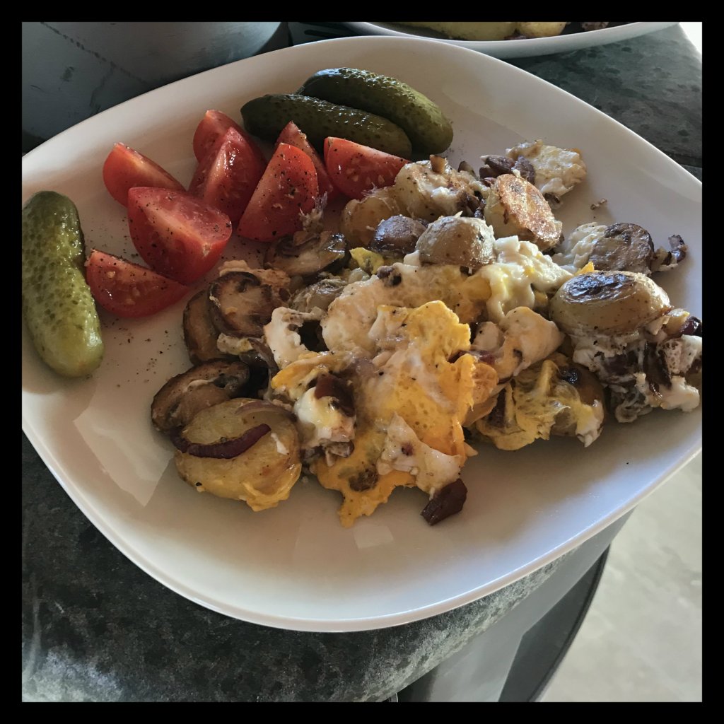 8 kl. gekochte Kartoffeln (ca. 275 g – ggf. Reste vom Vortag, sonst eben frisch kochen und abkühlen lassen) in ca. 0,5 cm dicke Scheiben schneiden, und in einer Pfanne