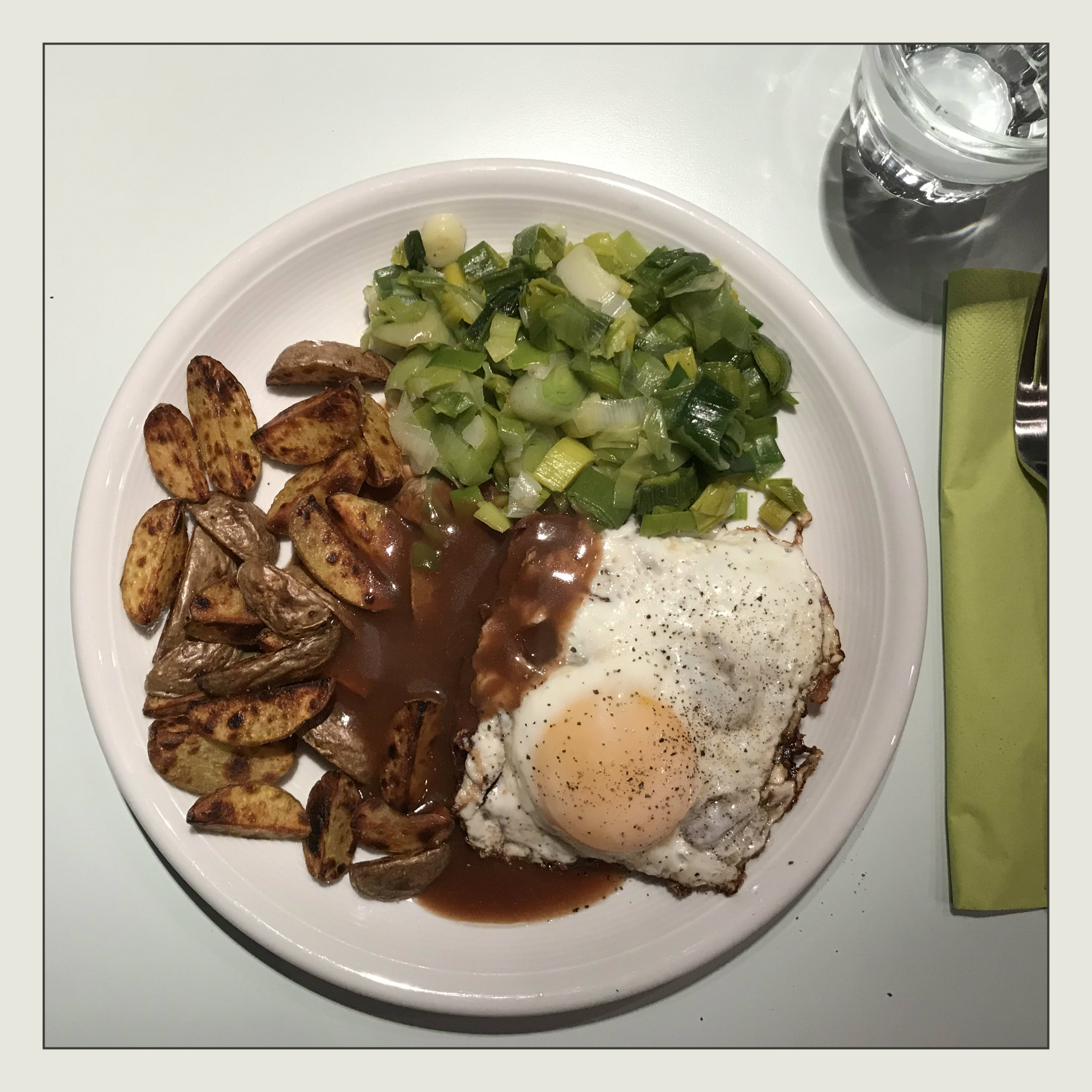 Porree mit Röstkartoffeln und Fleischkäse auf einem vorgewärmten Teller anrichten, die Sauce über Fleischkäse und vielleicht teils die Kartoffeln geben und das Spiegelei auf den Fleischkäse setzen