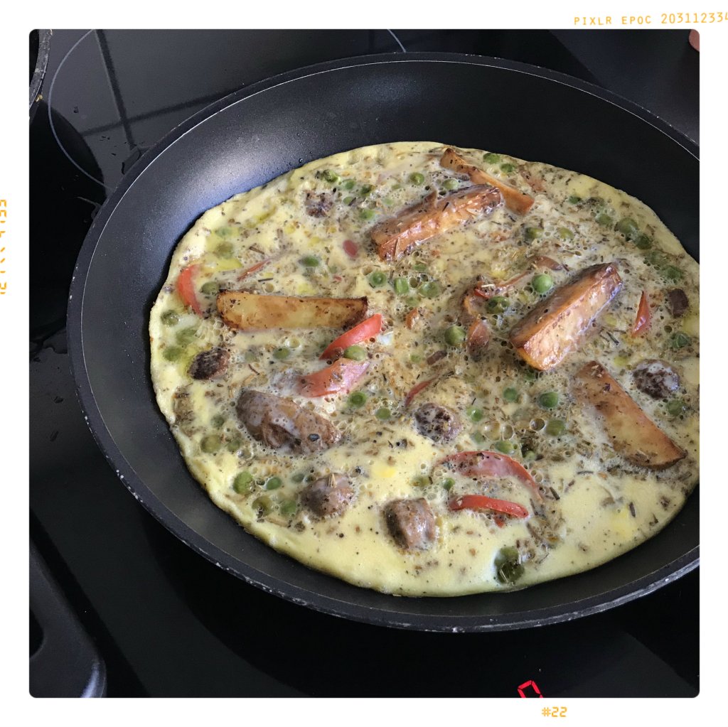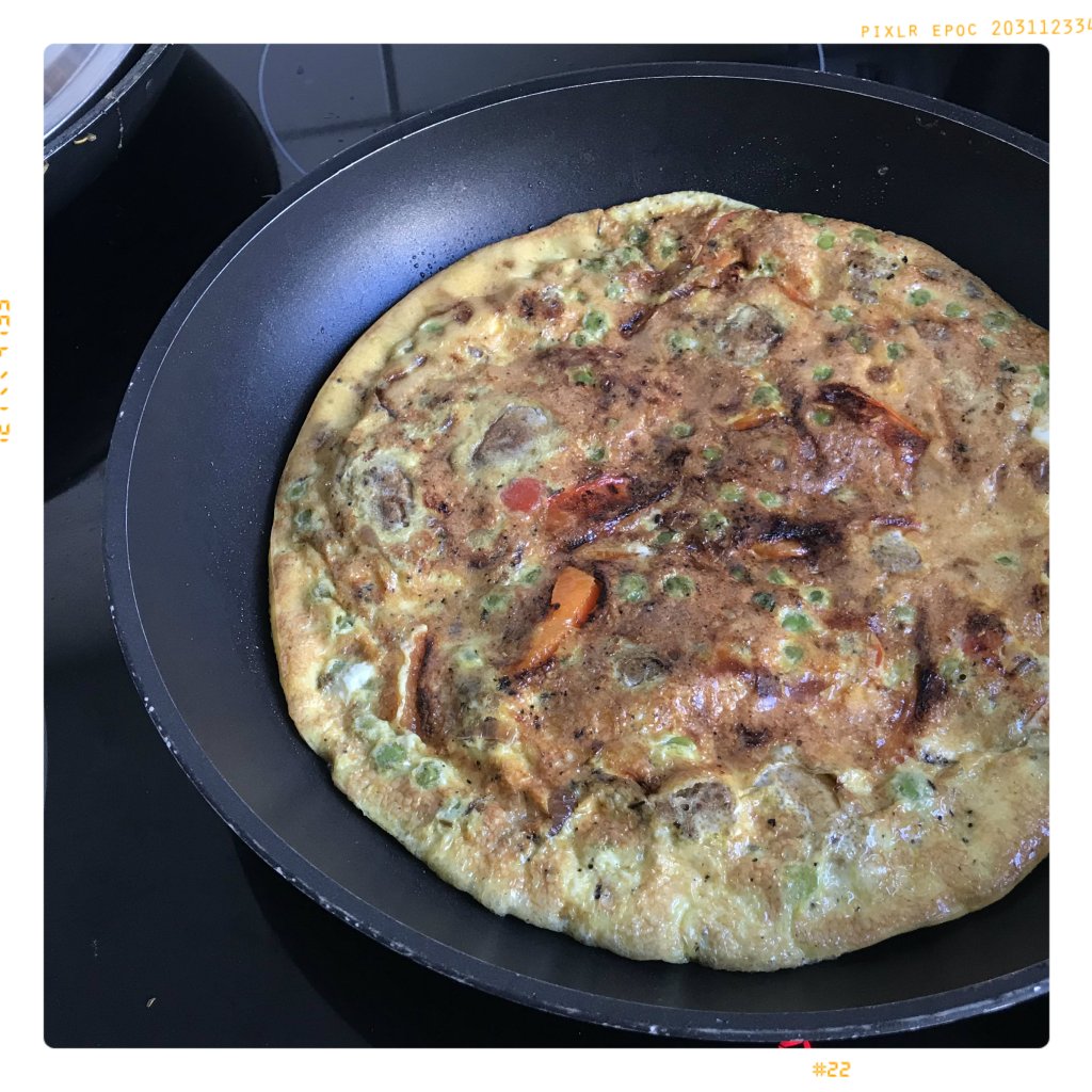1 EL Bratolivenöl in der Pfanne mittelstark erhitzen, die Eimasse in die Pfanne geben und die Pfanne sofort schließen, nach ca. 3 Minuten die Hitze auf mittelschwach reduzieren und ca. 10 Min. garen,
