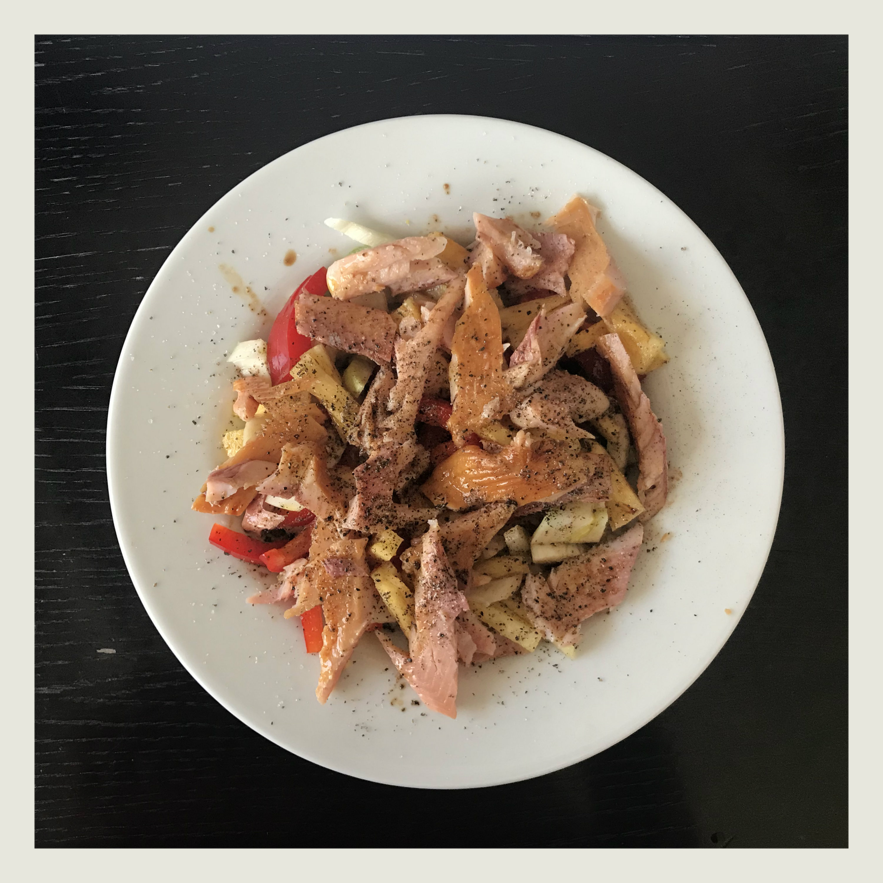 125 g geräuchertes Forellenfilet in Stücke teilen und alles mit einem Dressing aus