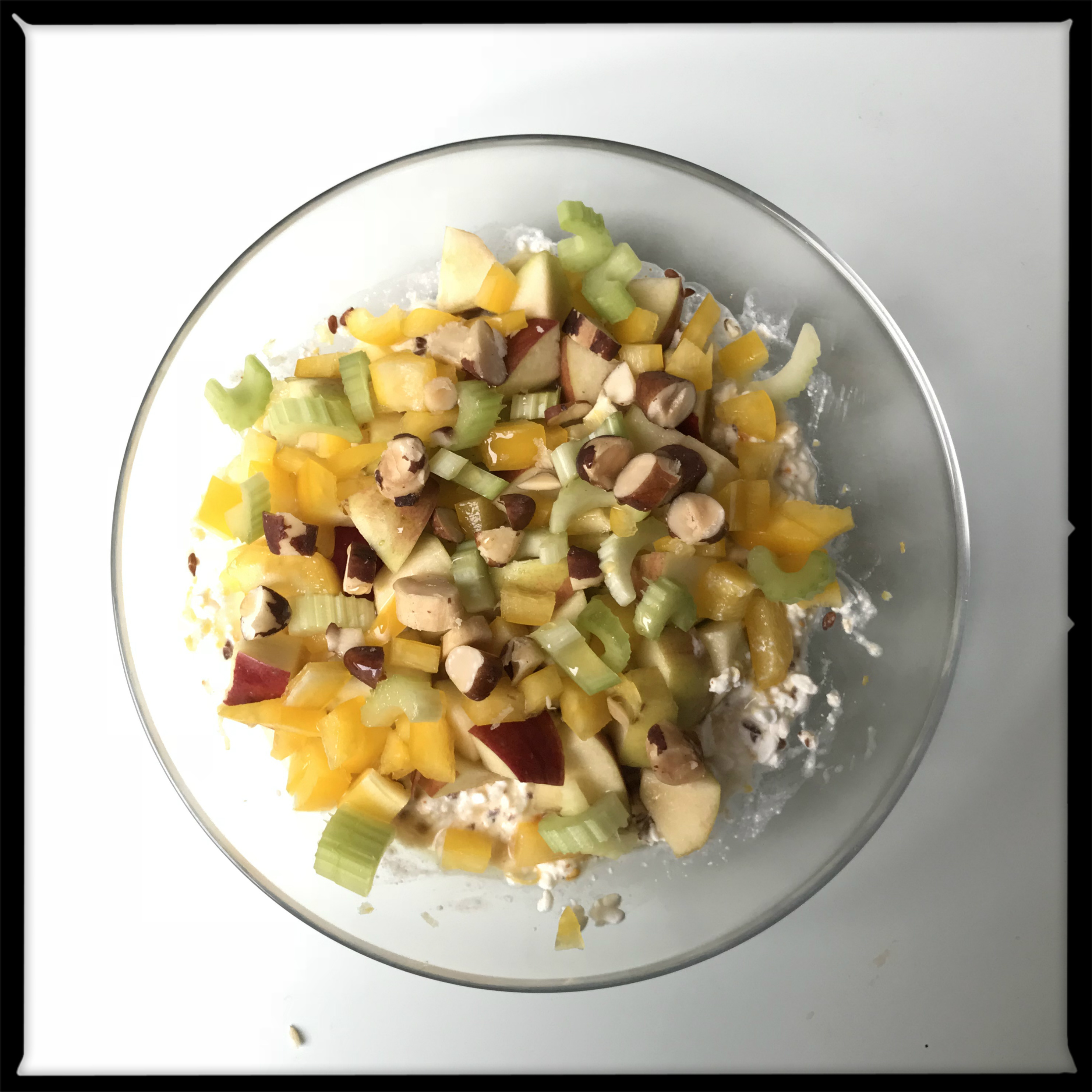 1 Stange Staudensellerie in dünne Scheiben schneiden, auf den Hüttenkäse geben, mit