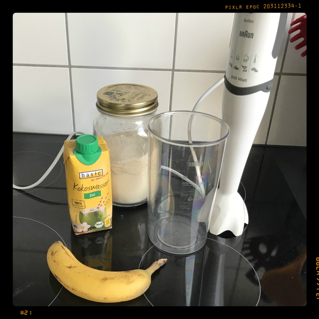 1 kleine reife Banane mit dem Mixstab pürieren,