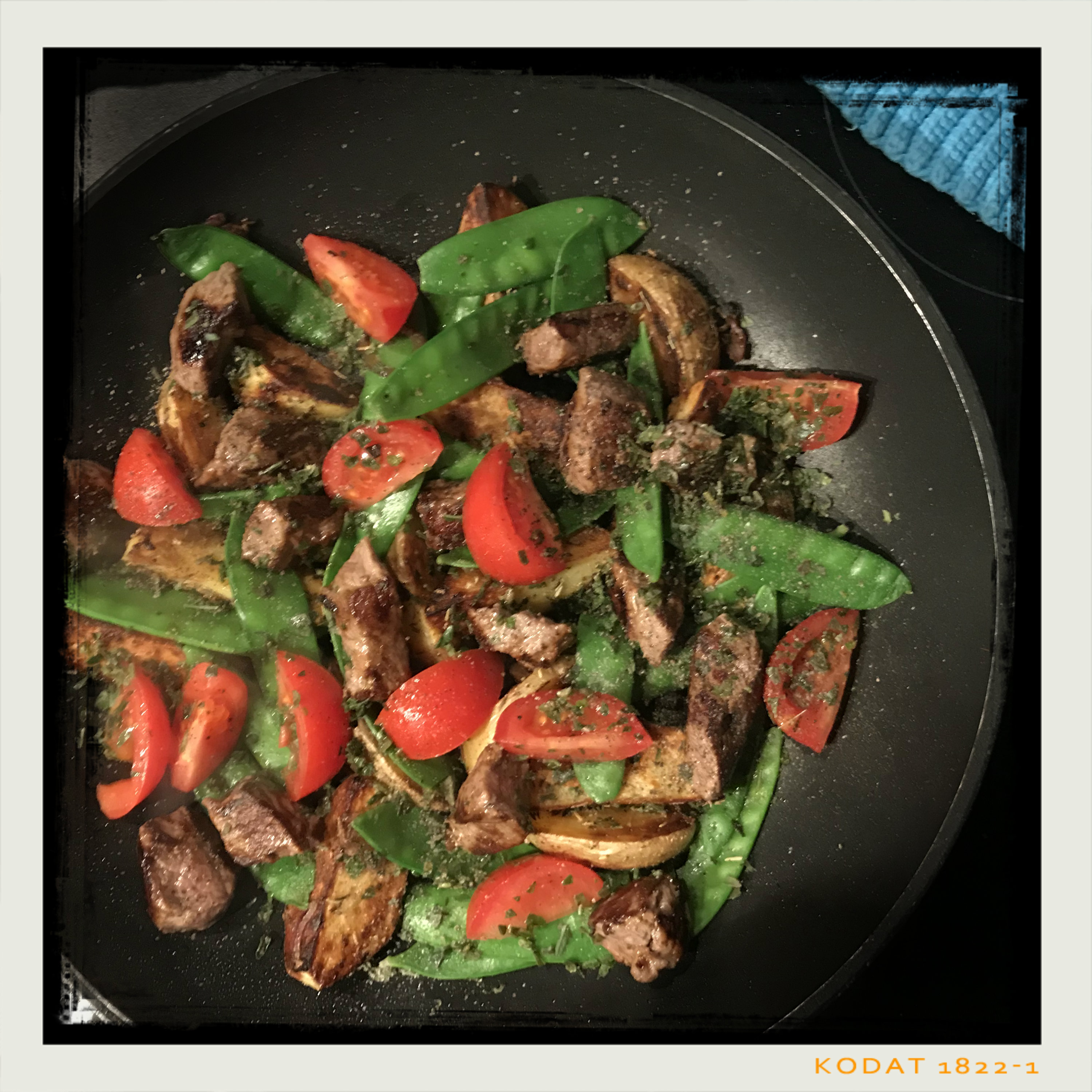 1 EL Brat-Olivenöl von allen Seiten kurz scharf anbraten, dann aus der Pfanne nehmen und beiseitestellen, im Bratensatz bei schwacher Hitze die Zwiebelringe unter dem Deckel kurz schmoren, dann auf mittlere Hitze erhöhen, die Kartoffeln wieder in die Pfanne geben und mit den Zwiebeln mischen, die Zuckerschoten, Steakstreifen, Tomaten und