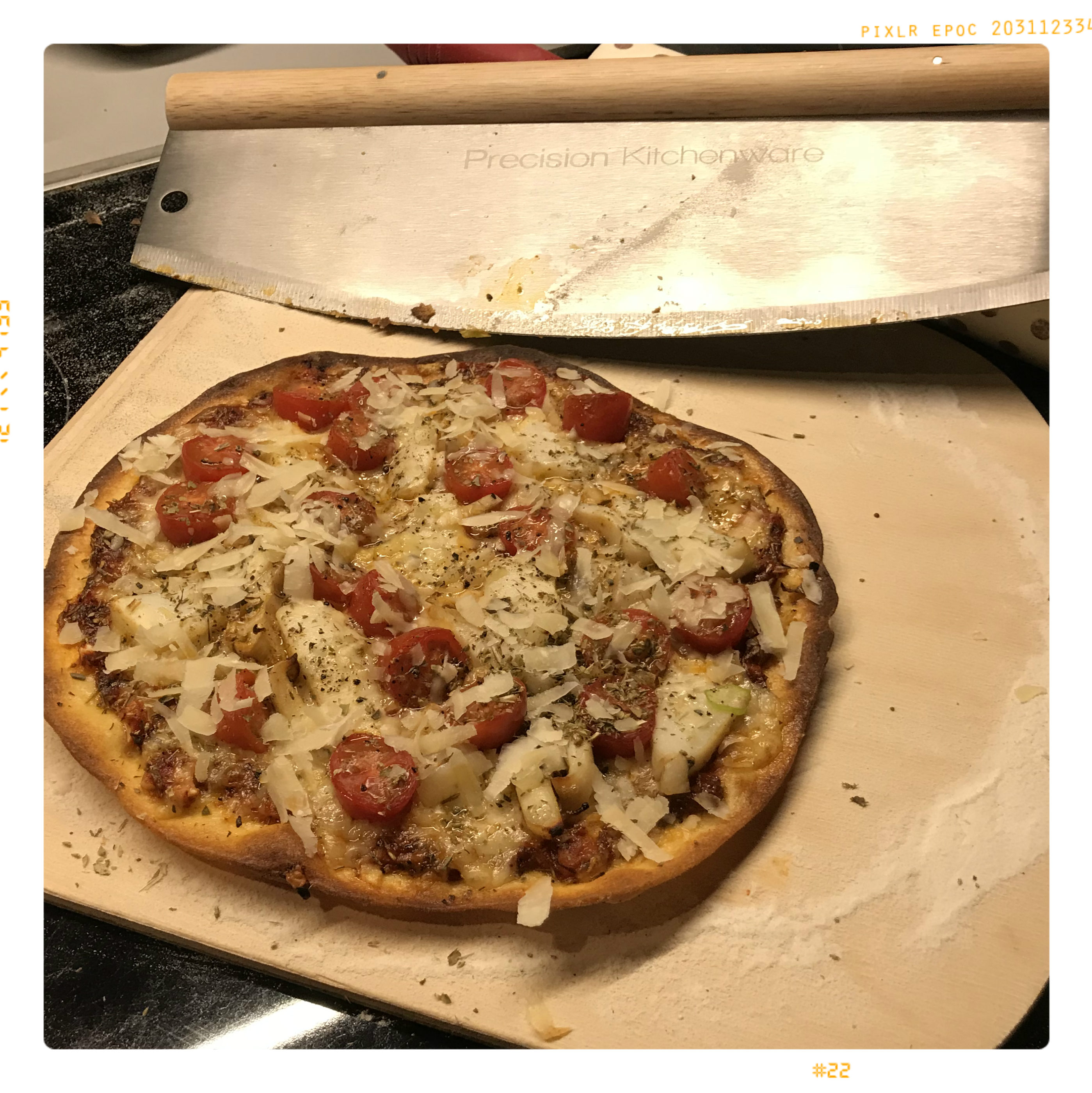 1 Kugel Pizzateig aus dem Kühlschrank nehmen und in der Folie Raumtemperatur annehmen lassen