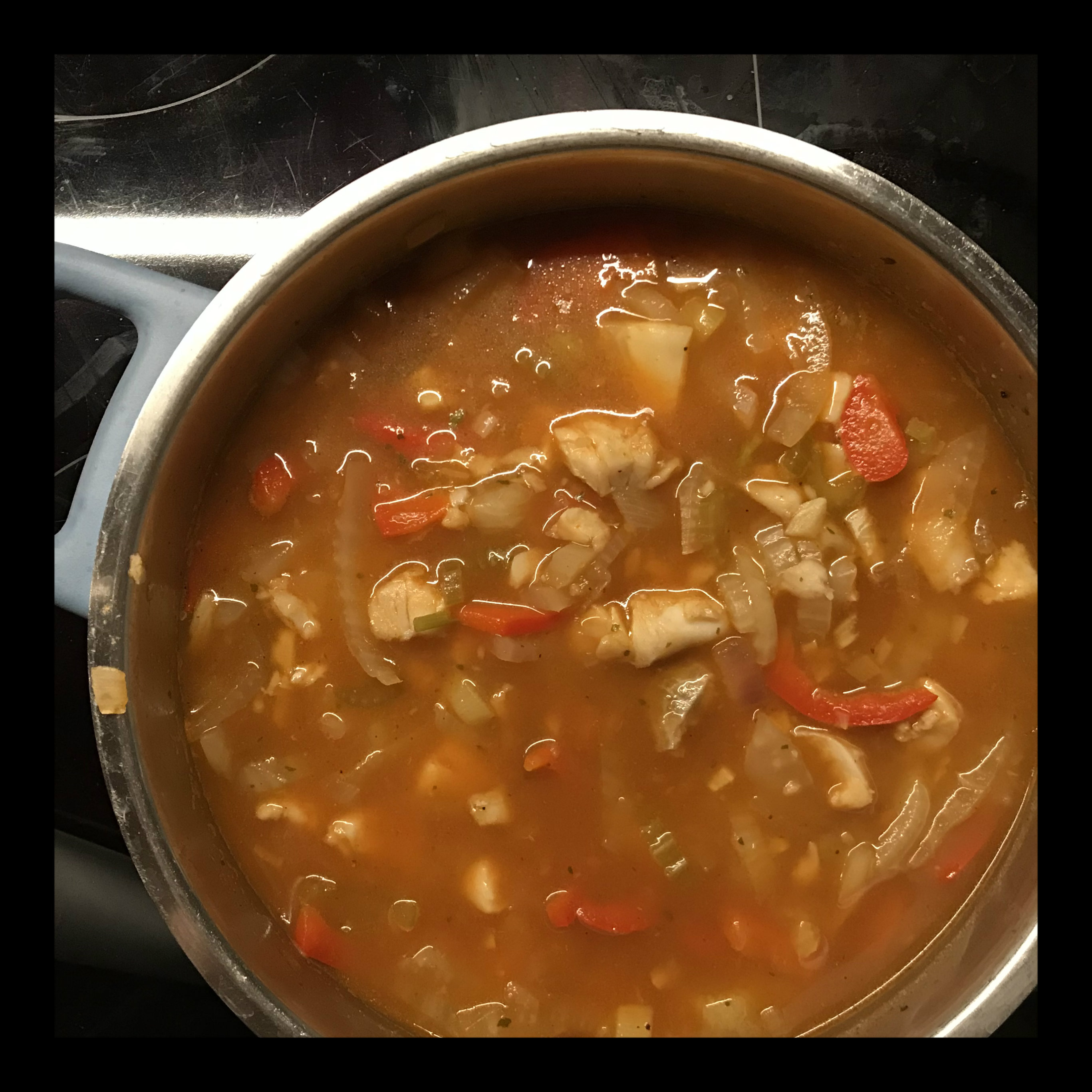 100 ml heißes Wasser und die Fischfiletstücke zur Suppe geben, und bei mittlerer Hitze noch weitere 3 Min. köcheln lassen, mit