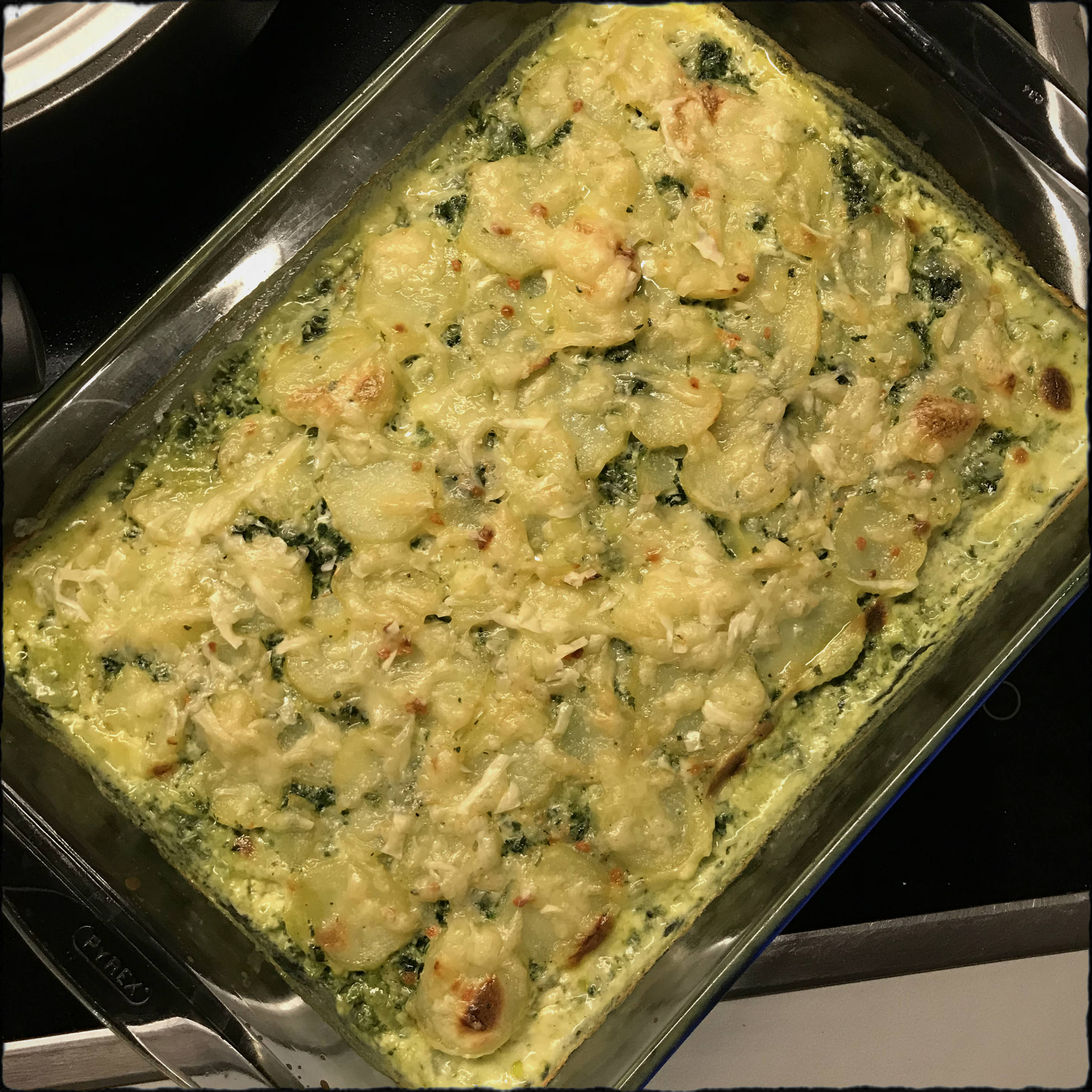 ggf. Salz würzen, dann auf den Kartoffeln verteilen, die zweite Hälfte der Kartoffelscheiben auf der Spinatschicht auslegen und die restliche Creme fraiche-Mischung darauf verteilen