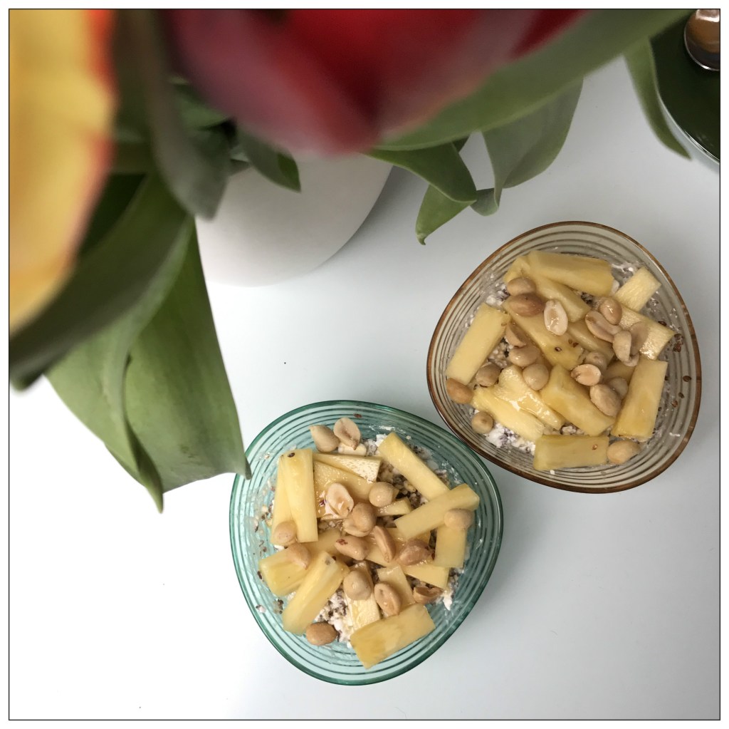 1 Scheibe Ananas (ca. 12 mm dick) in kleine Stücke schneiden und auf die beiden Portionen verteilen, dann