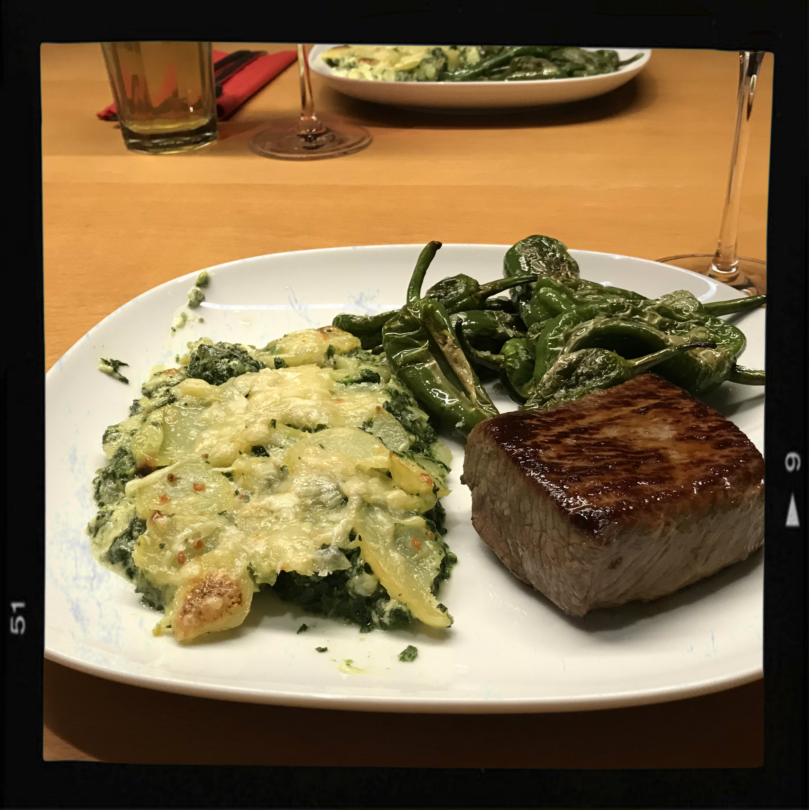 für zwei passt es gut mit dem Kartoffel-Spinat-Gratin vom 10. April und den Pimientos vom 14. April 2018, dafür zuerst das Kartoffelgratin zubereiten und während das im Ofen ist, die Steaks und Pimientos braten