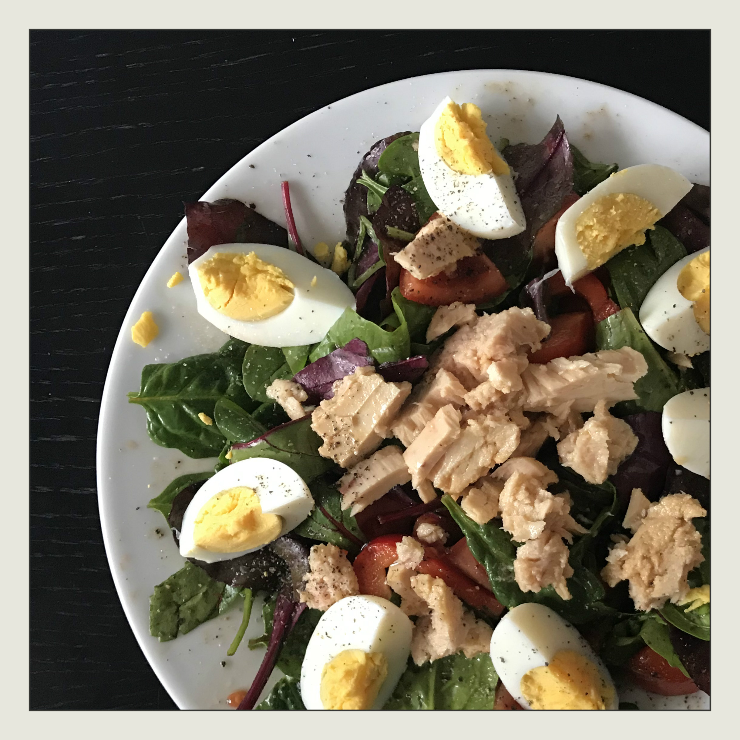 1 Dose Bonito (ca. 70 g, in Olivenöl, ohne das Öl – ersatzweise Tunfisch) und die zwei Eier (geviertelt) darauf verteilen, noch ein wenig salzen und pfeffern
