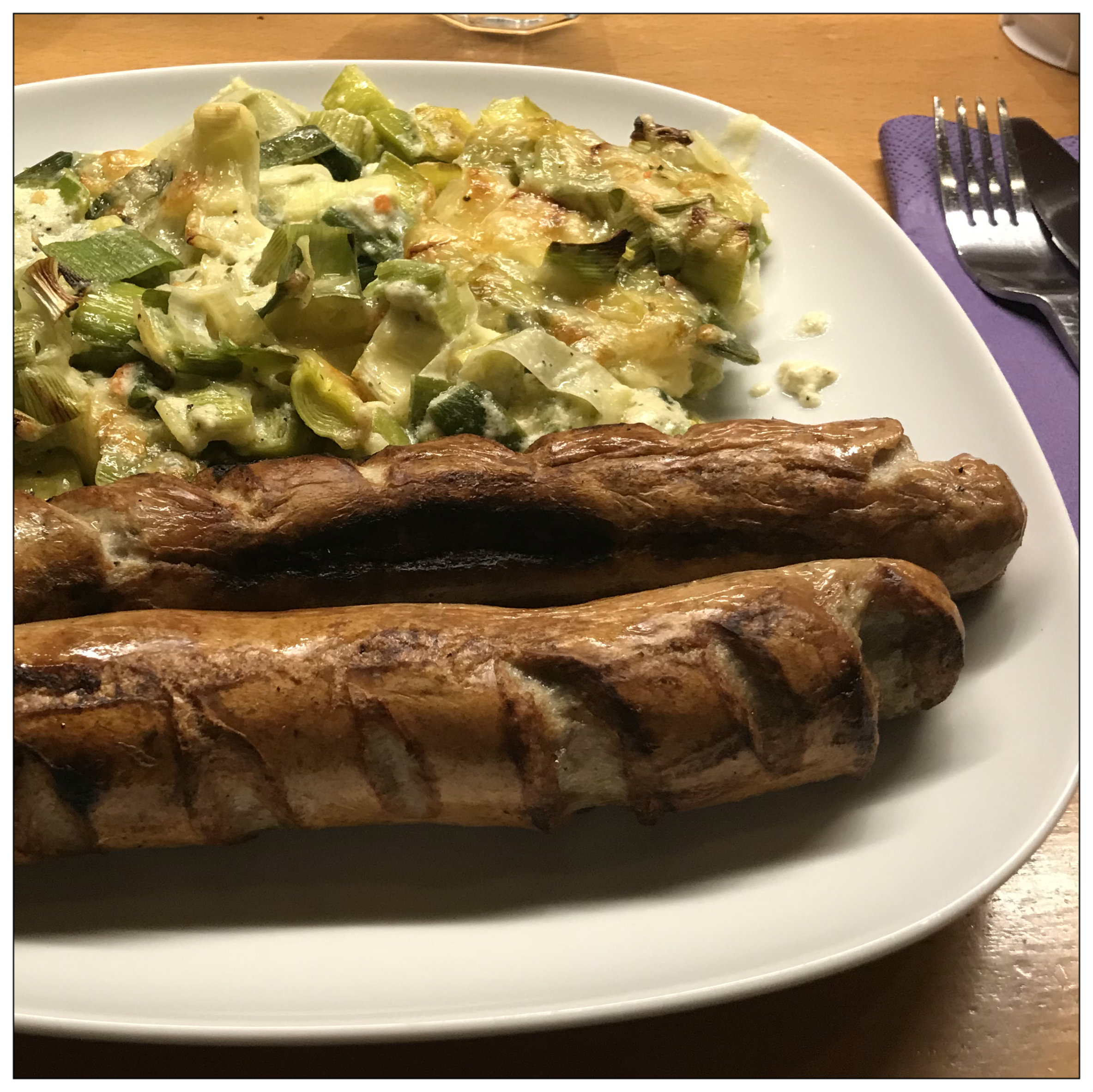 60 g Emmentaler grob reiben, auf dem Lauch verteilen und das Gratin für weitere 10 Min. in den Backofen geben