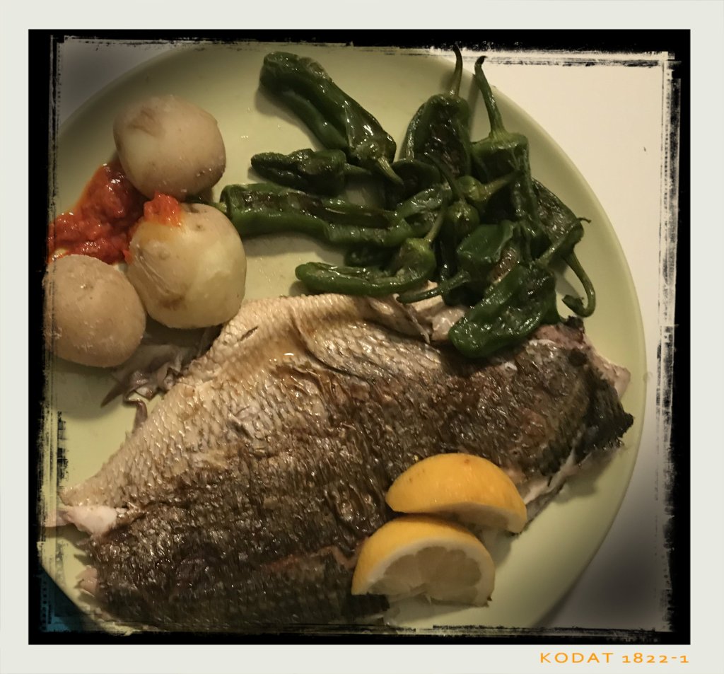 2 geh. EL roter Mojo (aus dem Glas oder nach Rezept Mojo pricón (rote Mojo) vom 29. März 2017) und den Brat-Paprika auf zwei vorgewärmten Tellern anrichten, die beiden Hälfen der Goldbrasse von der Mittelgräte ablösen, dazu legen und mit der Zitronenscheiben dekorieren (vor dem Verzehr mit dem Zitronensaft beträufeln)
